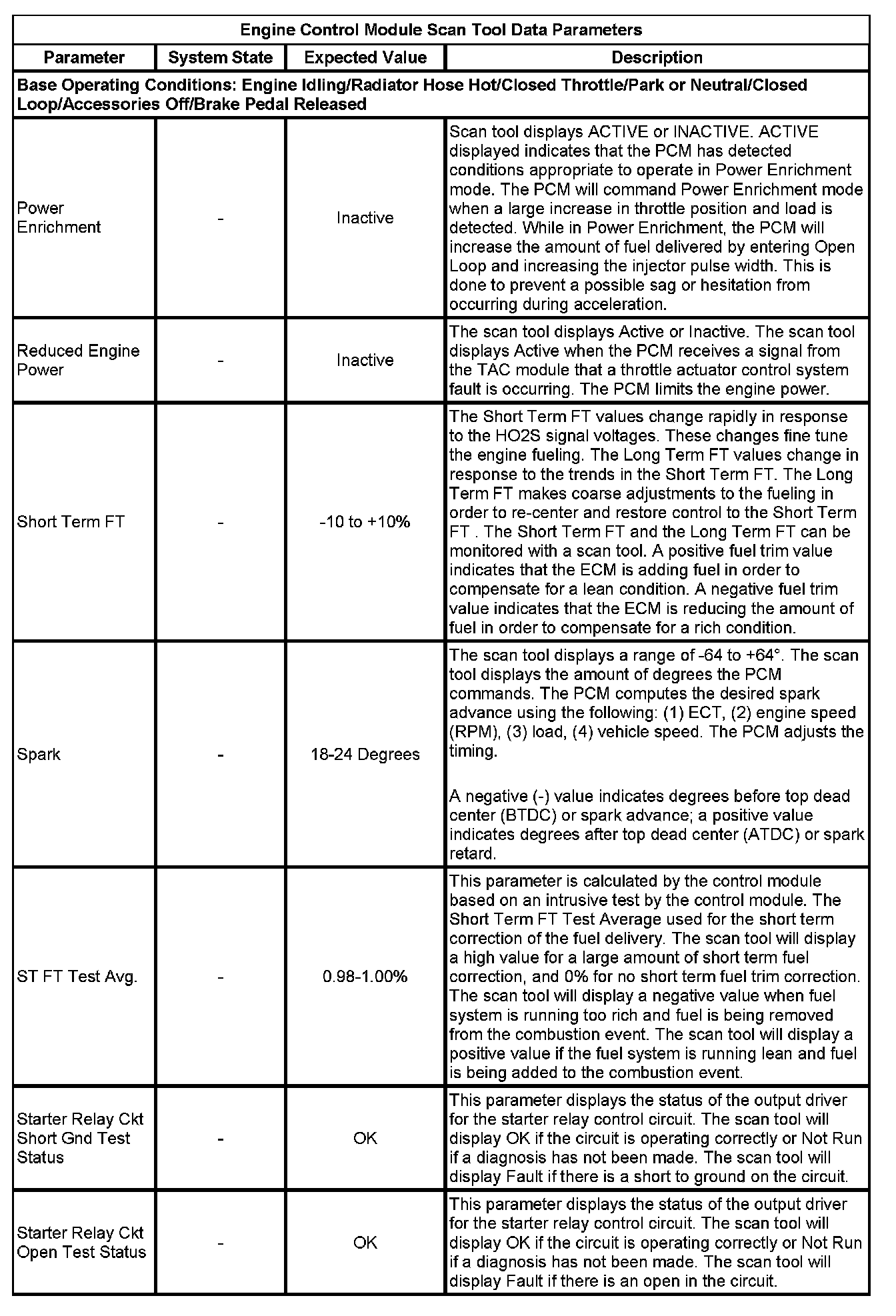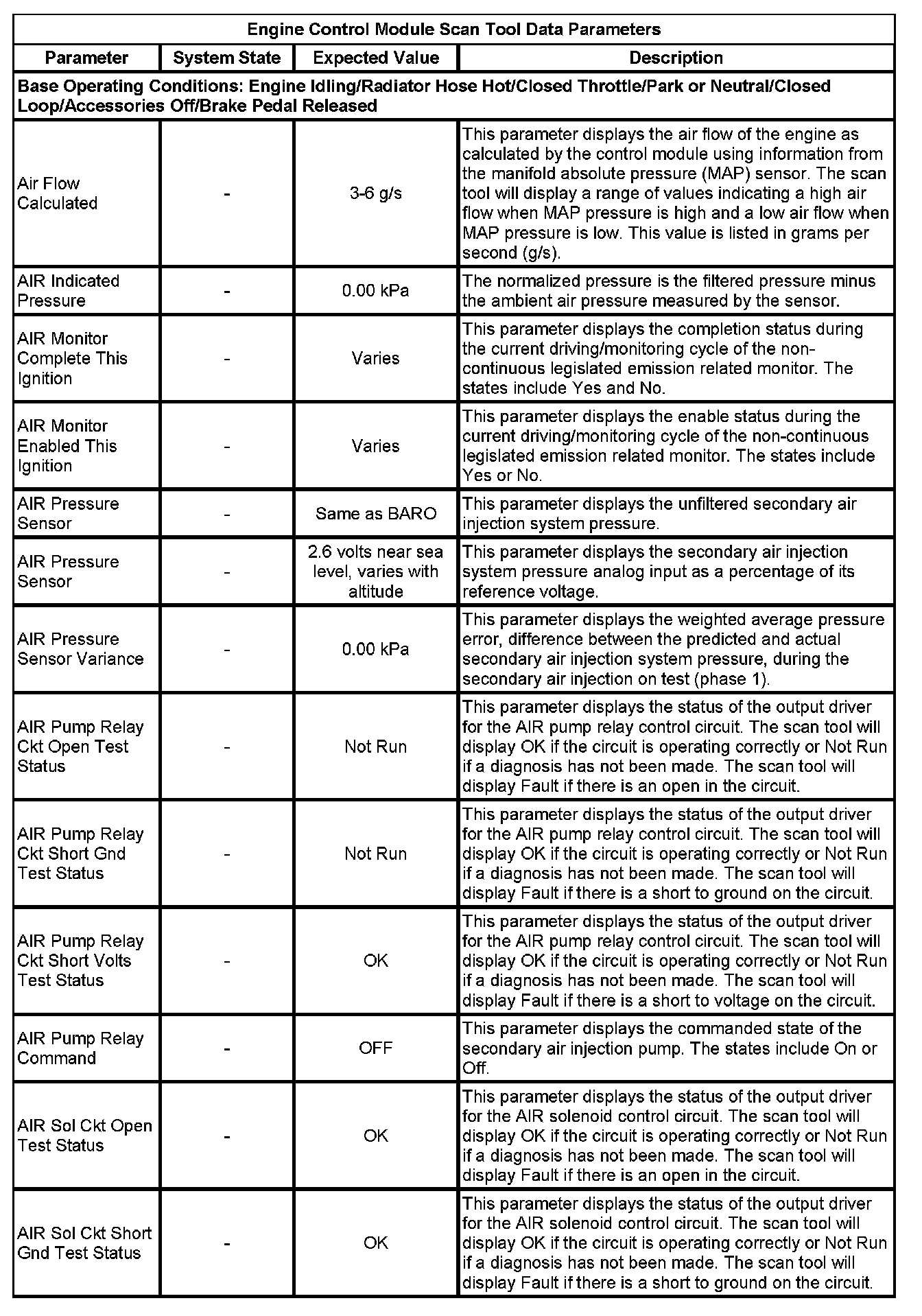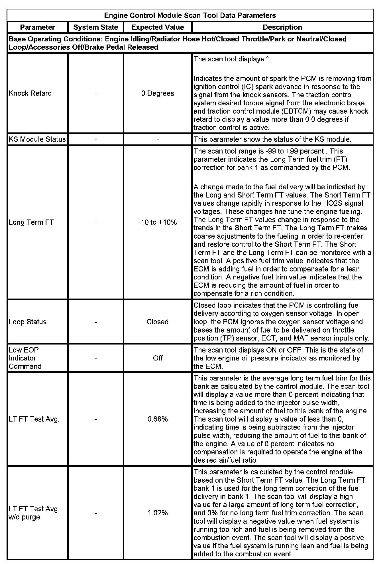 The scan tool values from a properly running engine may be used for comparison with the engine you are diagnosing. The Engine Scan Tool Data List represents values that would be seen on a normally running engine.