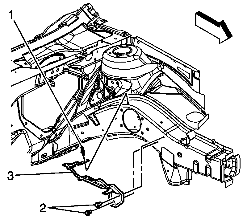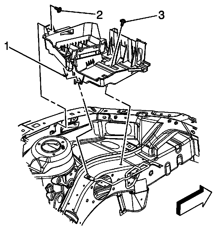 2. Remove the battery tray bolts (2, 3) and nut (1).