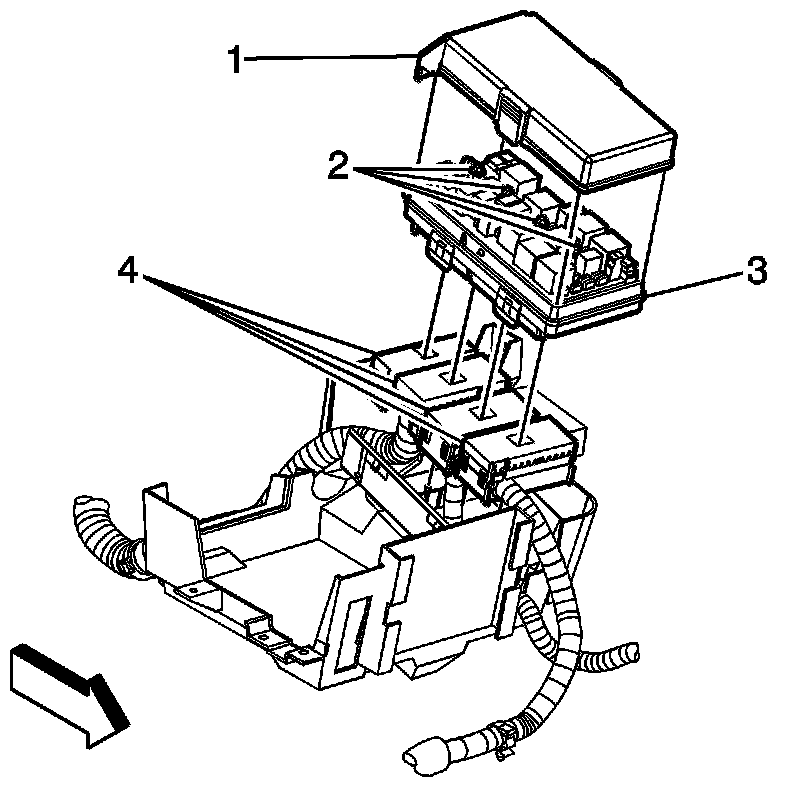 5. Reposition the junction block (3) and harness connectors (4) from the battery tray.