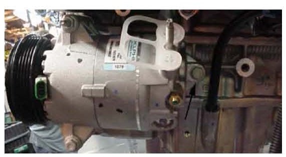 If the engine oil leak is diagnosed as coming from the rear A/C bolt hole mounting bracket, use the following repair procedure to correct the condition. The oil leak in this area is coming from a non-pressurized hole.