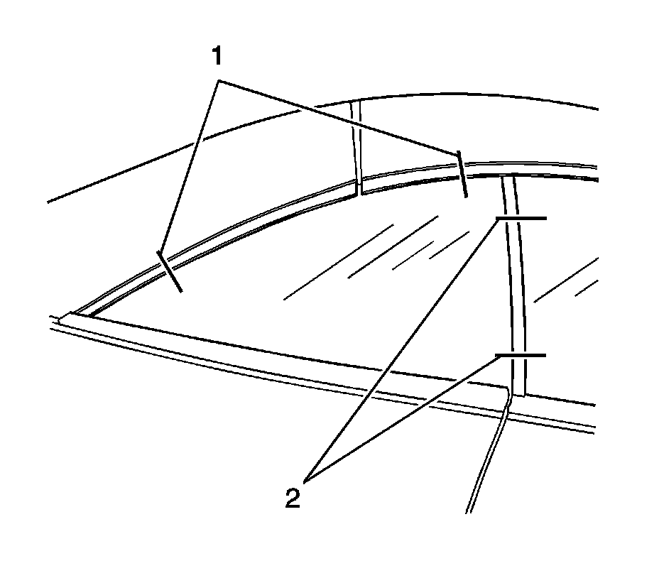 3. With the aid of an assistant on the inside of the vehicle loosen and retighten the window clamps (1, 2) when the other technician will reposition the window from outside the vehicle.