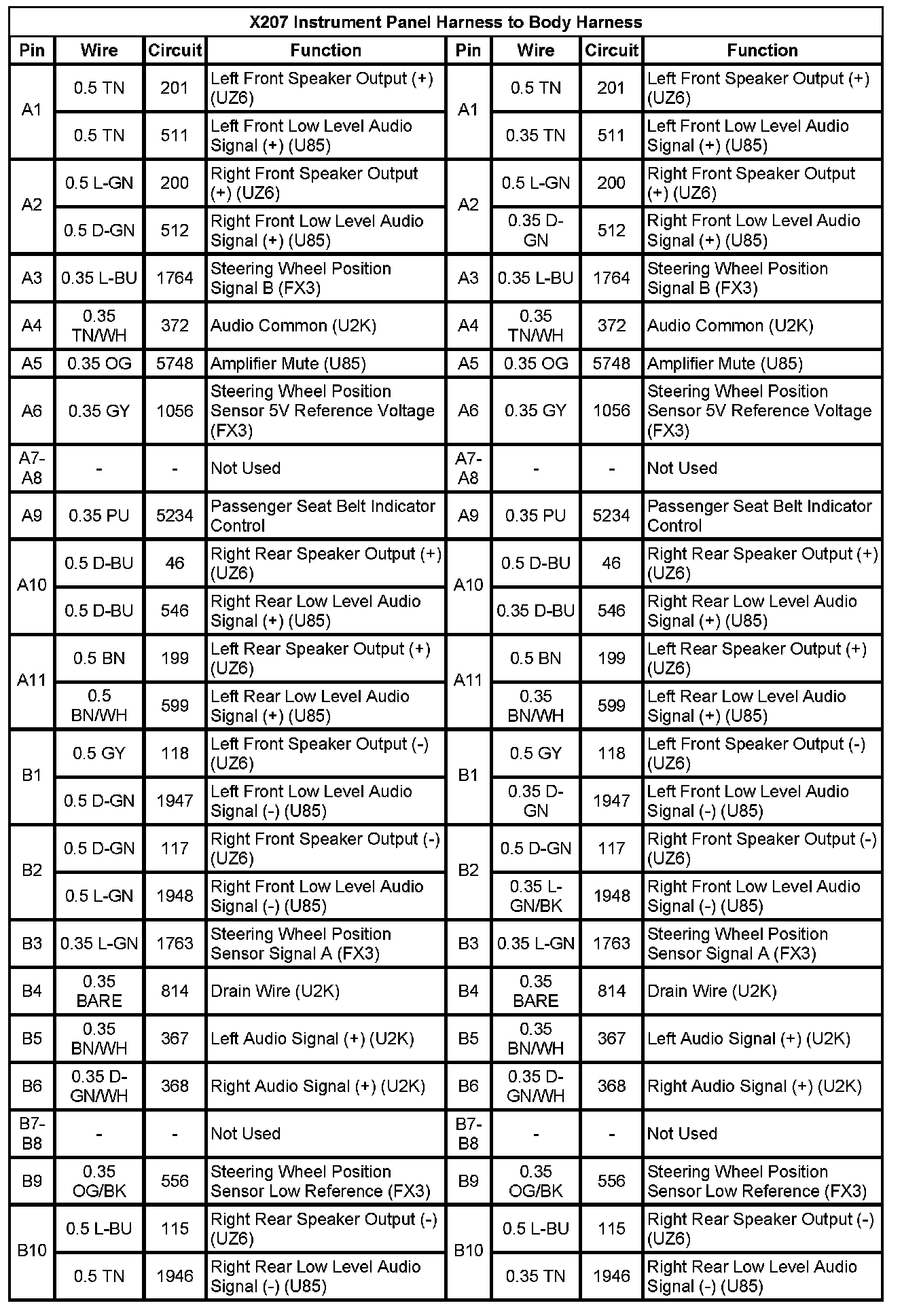 X207 Instrument Panel Harness To Body Harness (Pin A1 To B10):