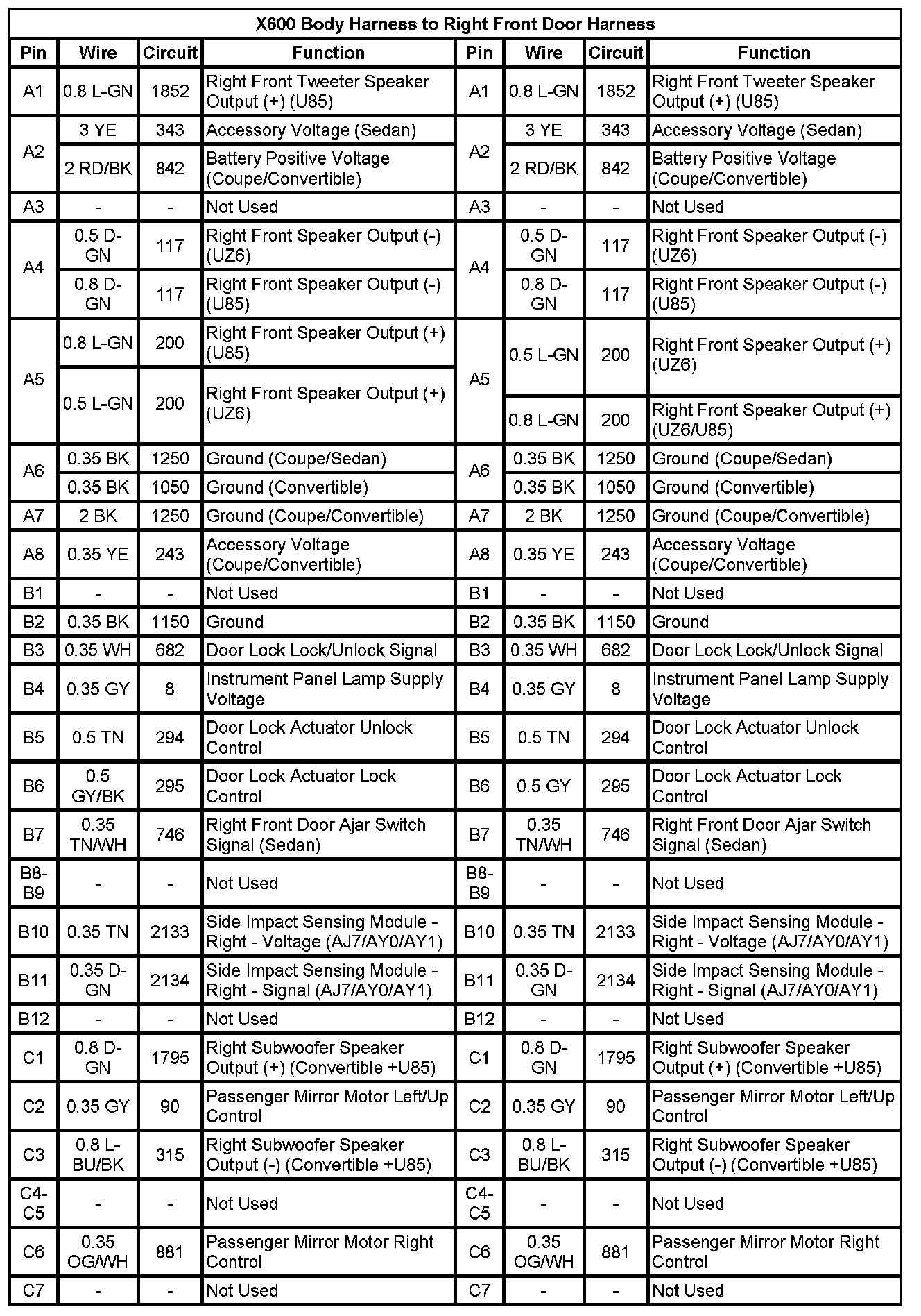 X600 Body Harness To Right Front Door Harness (Pin A1 To C7):