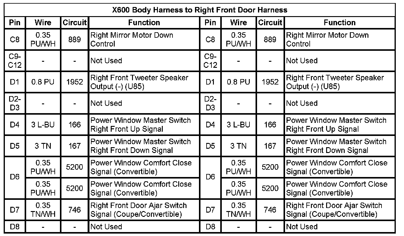 X600 Body Harness To Right Front Door Harness (Pin C8 To D8):