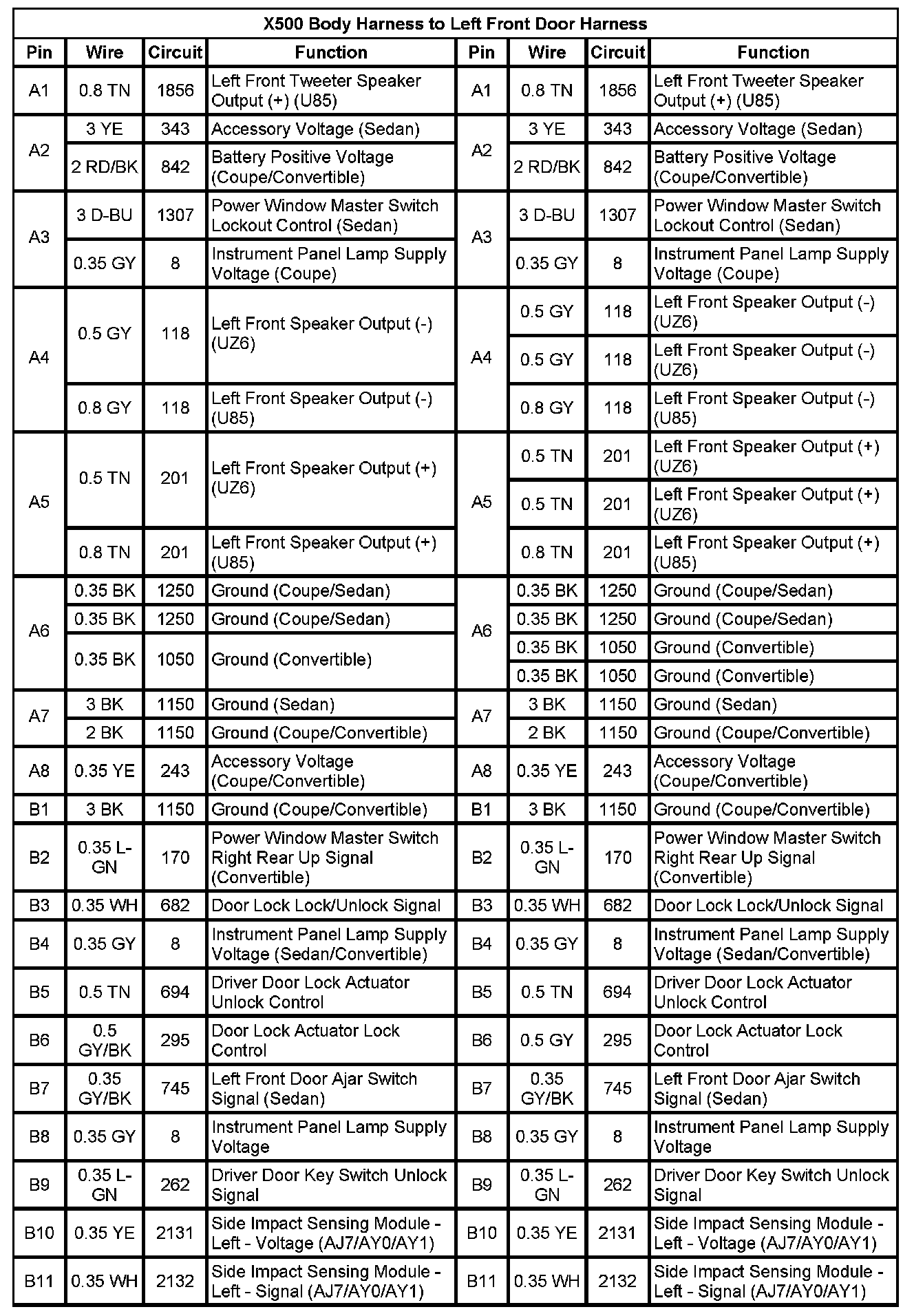 X500 Body Harness To Left Front Door Harness (Pin A1 To B11):