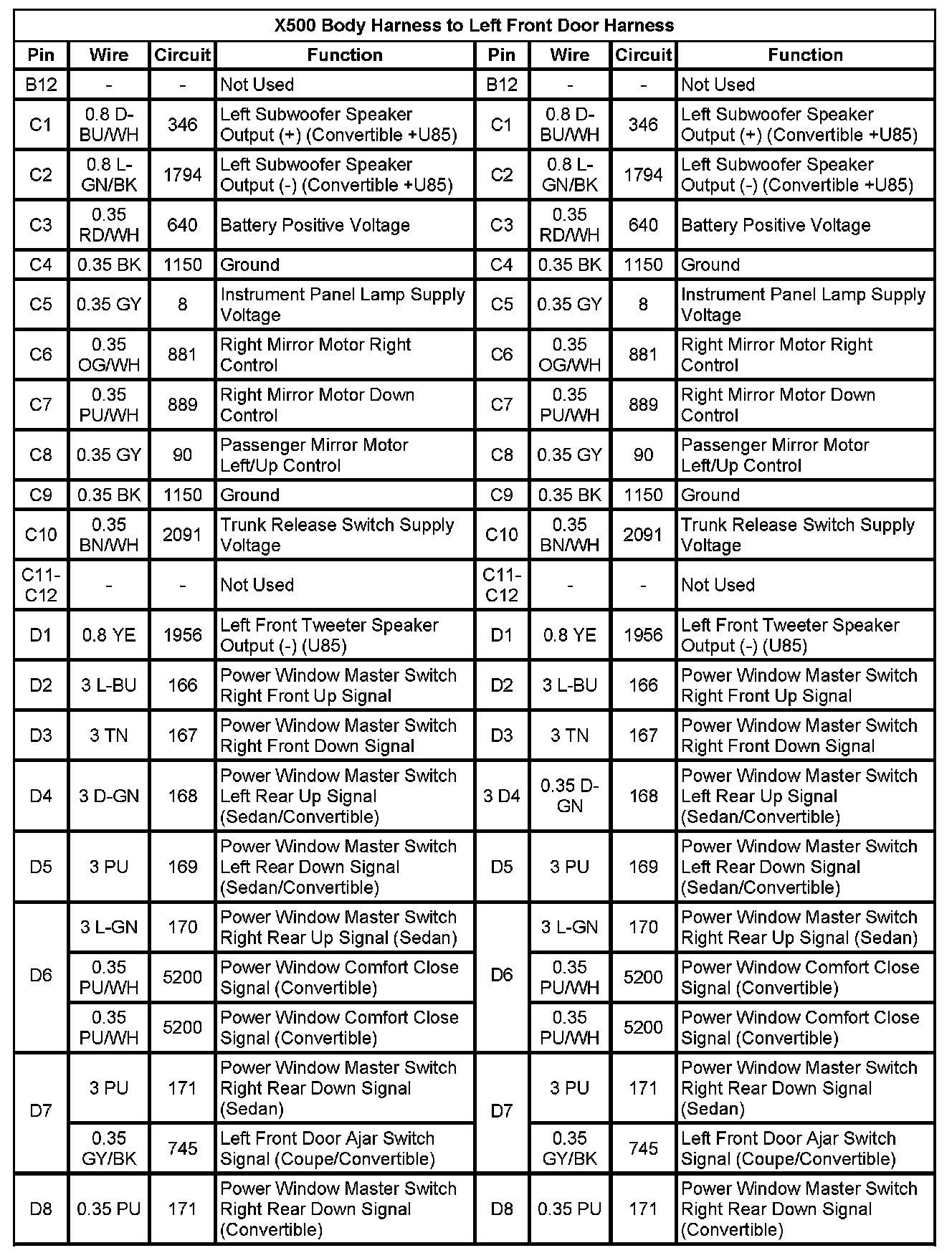 X500 Body Harness To Left Front Door Harness (Pin B12 To D8):