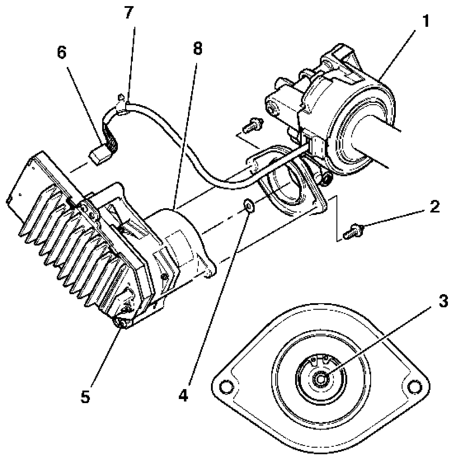 1. Insert the rotor isolator bumper (1) into the rotor isolator (3) in the power steering assist motor (2).