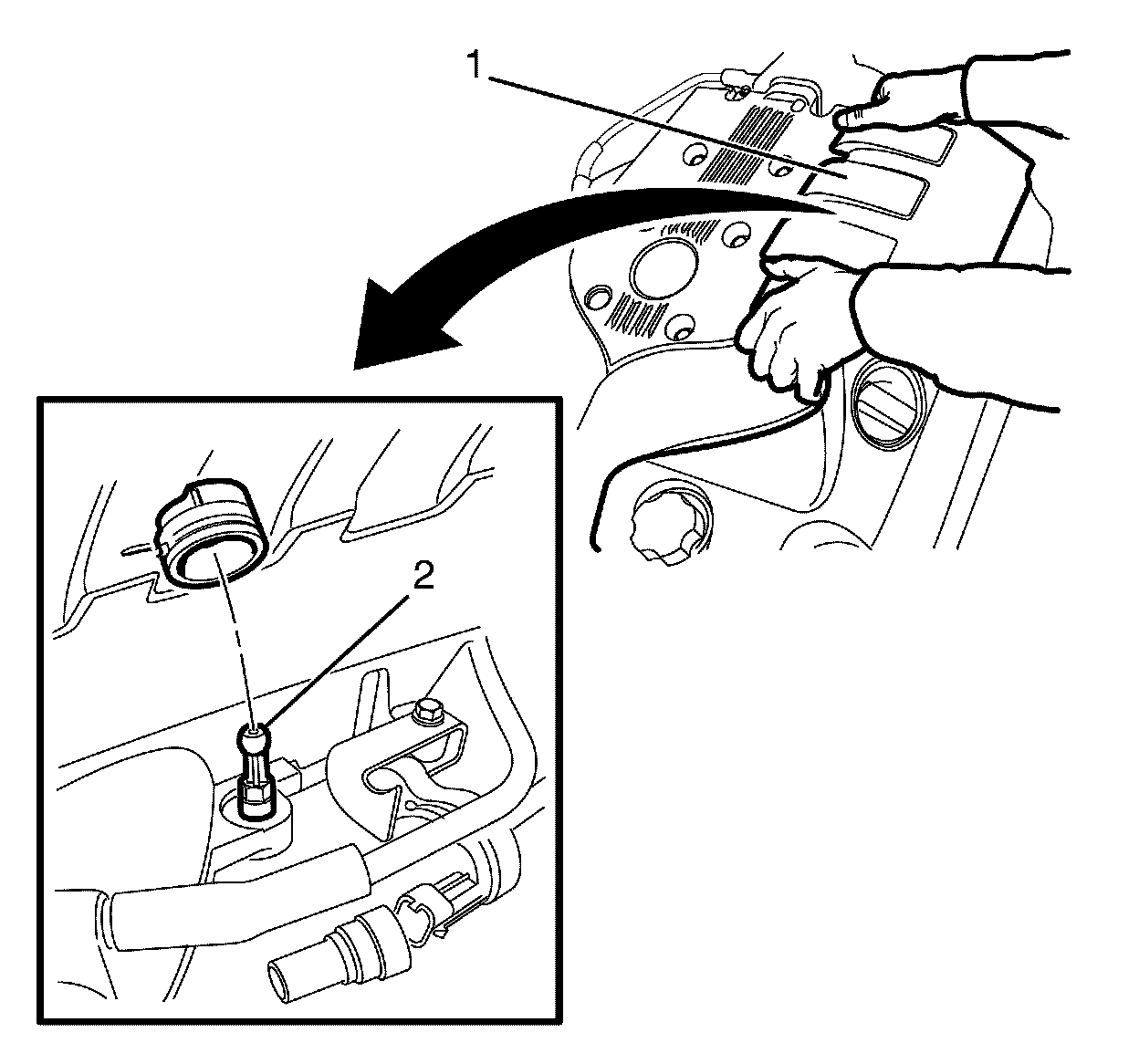 Important: Grasp and pry the engine covers (1) upwards to detach the engine covers (1) from the outer retaining clips (2).