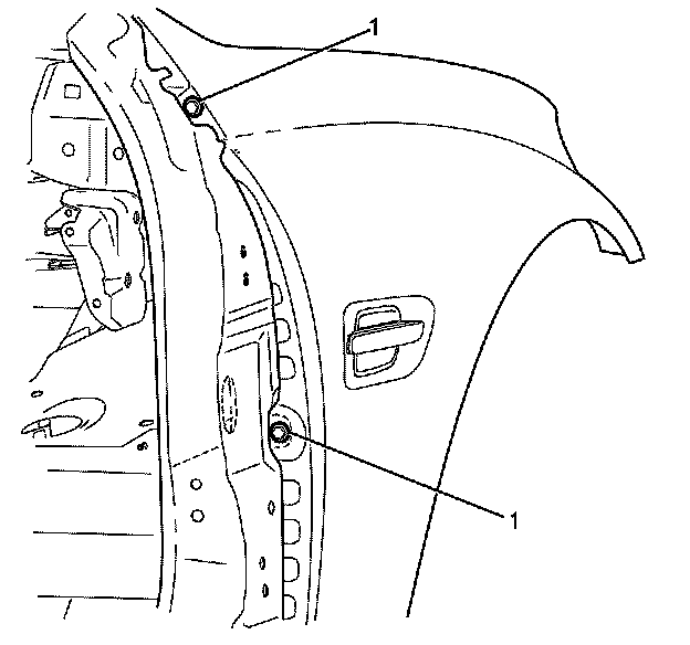10. Tighten the front fender to door pillar retaining bolts (1).