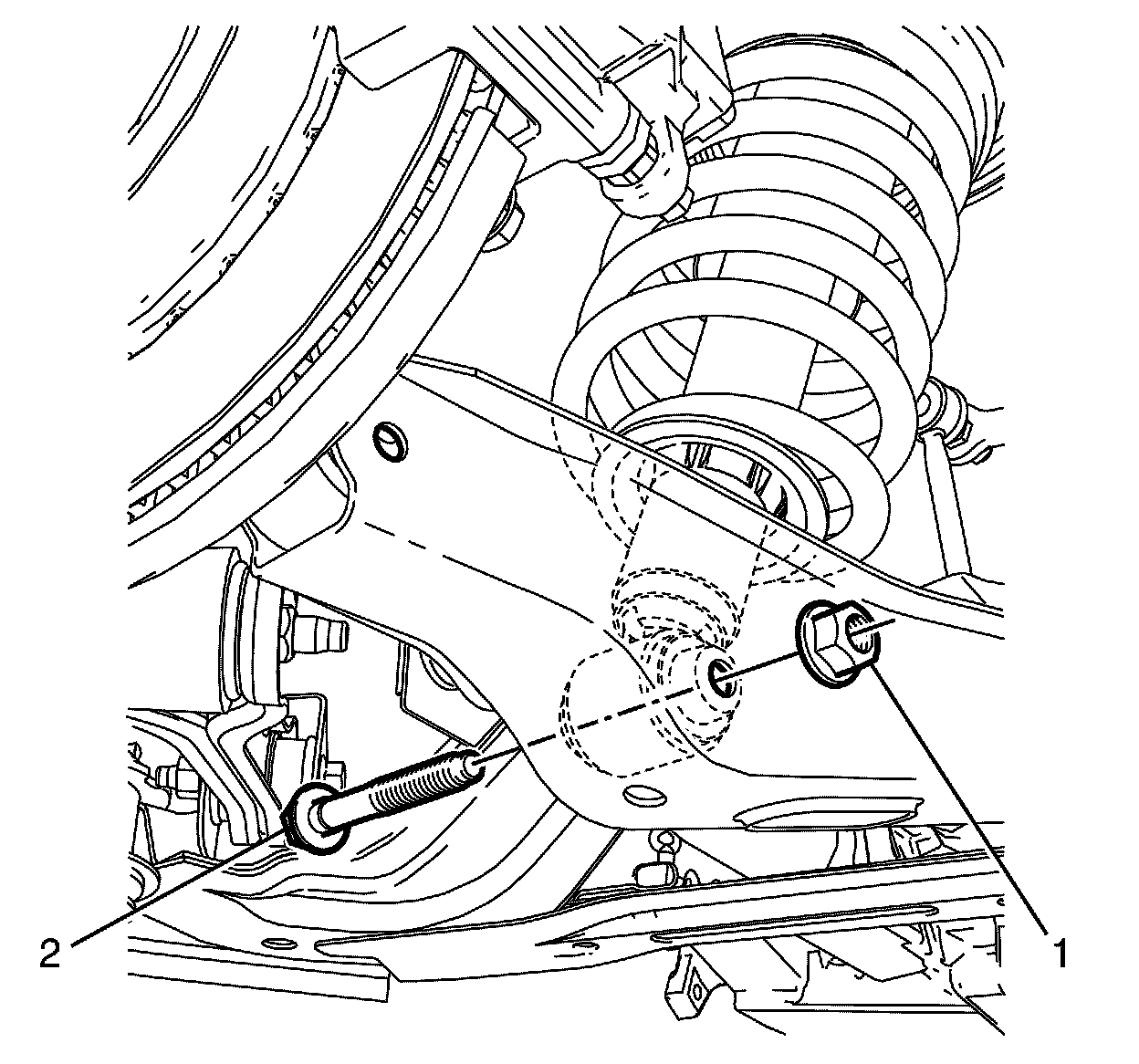 Important:Do not fully tighten the lower control arm to strut assembly retaining bolt (2) and nut (1) at this stage.