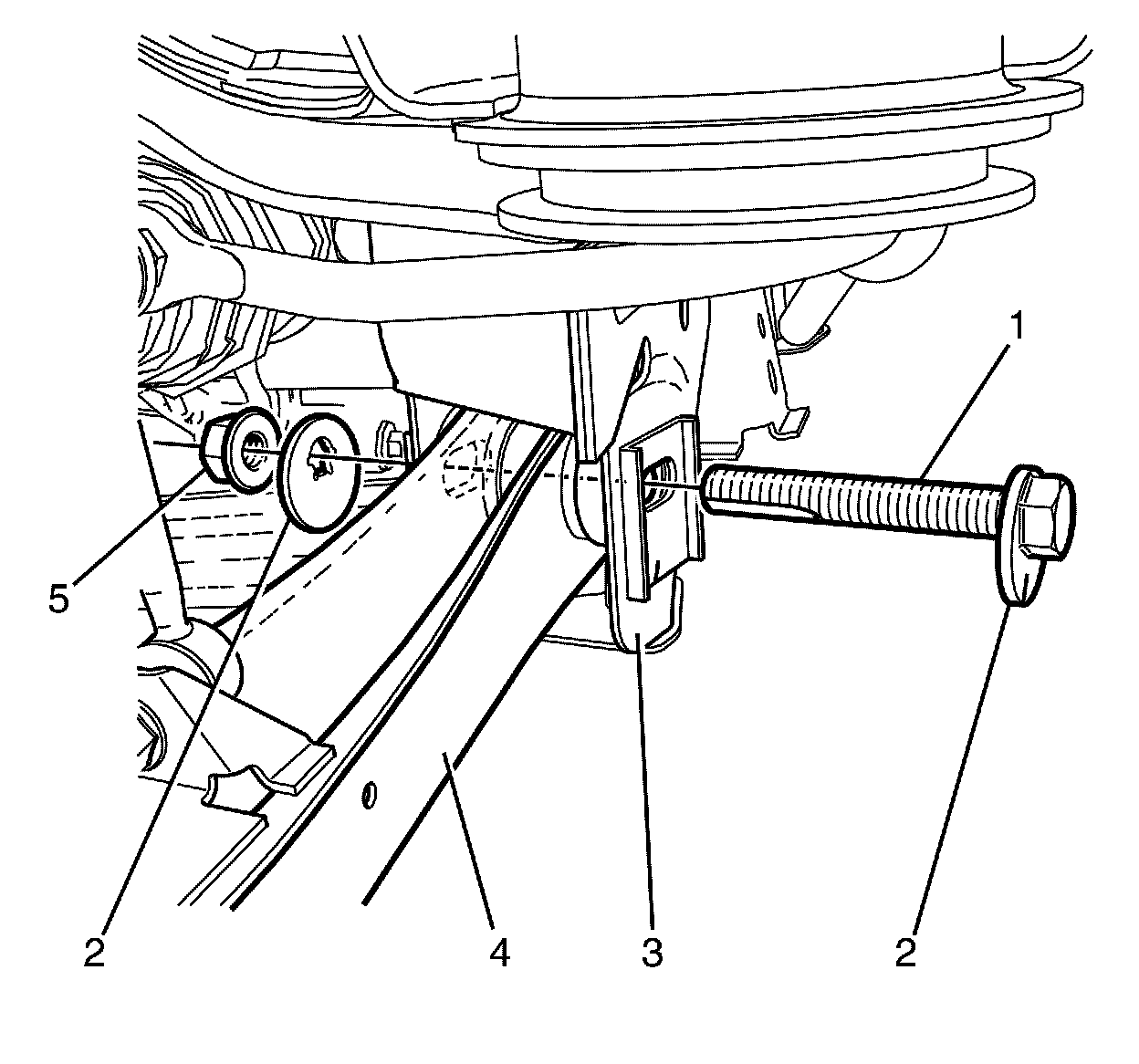 1.Remove the lower control arm to subframe retaining bolt (1) and nut (5).