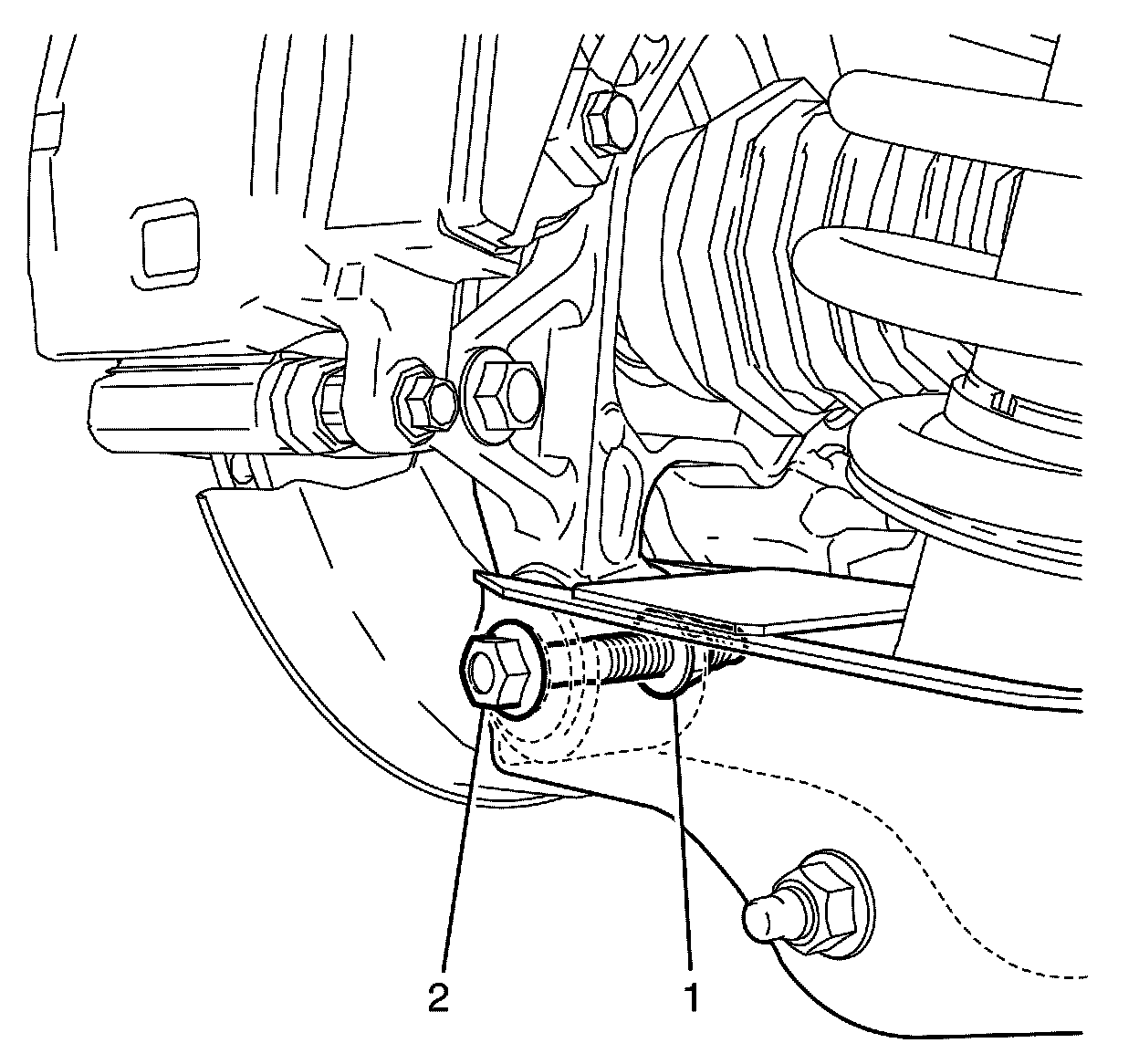 2.Tighten the lower control arm to subframe retaining bolt (1) and nut (2).