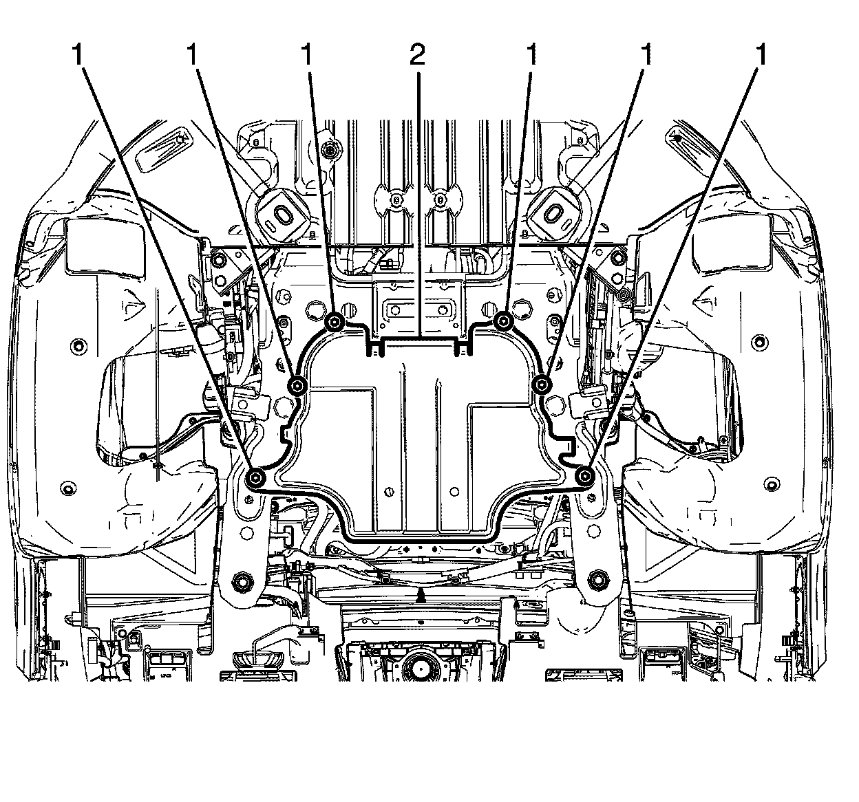 1.Install the engine splash shield (2) to the front subframe.