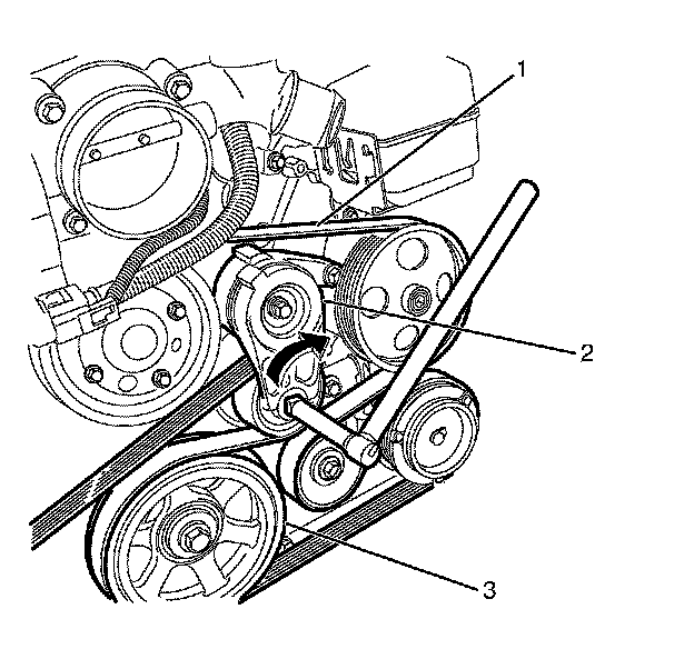 3. Rotate the drive belt tensioner (2) clockwise in order to release tension on the drive belt (1).