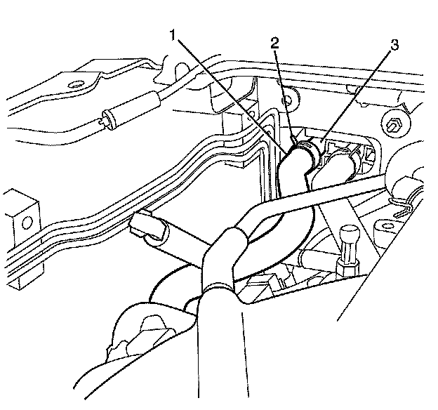 Important: Using a suitable tool, detach the heater outlet hose (1) by releasing the heater outlet hose quick connect fitting retaining clip (3).