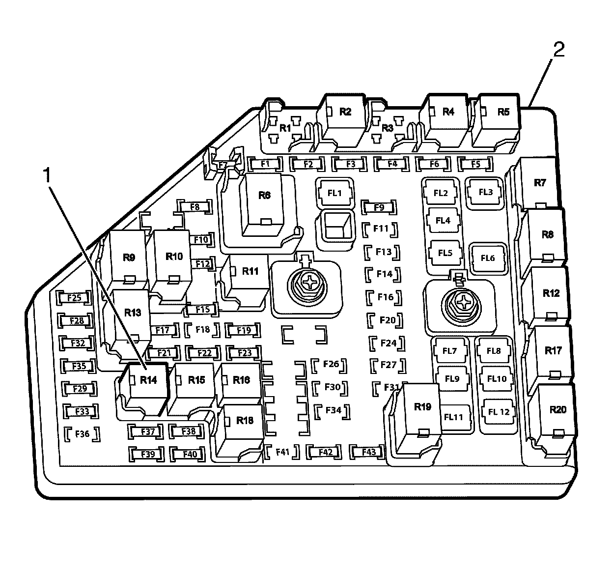 Important: Remove the ignition relay (1) from the under hood body electrical centre (2).