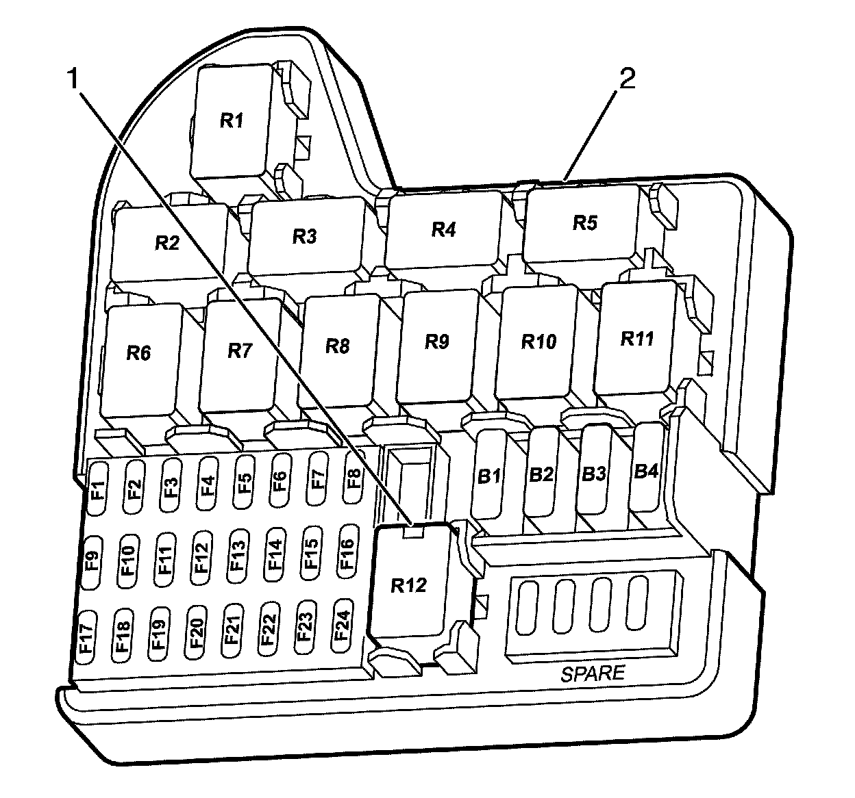 Important: Install the ignition relay (1) to the under bonnet fuse block (2).