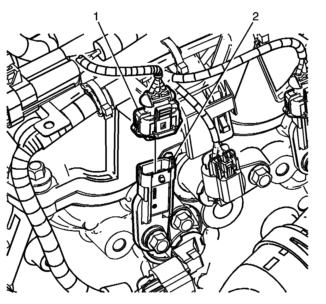 3. Install the CMP sensor electrical connector (1) to the CMP sensor (2) .