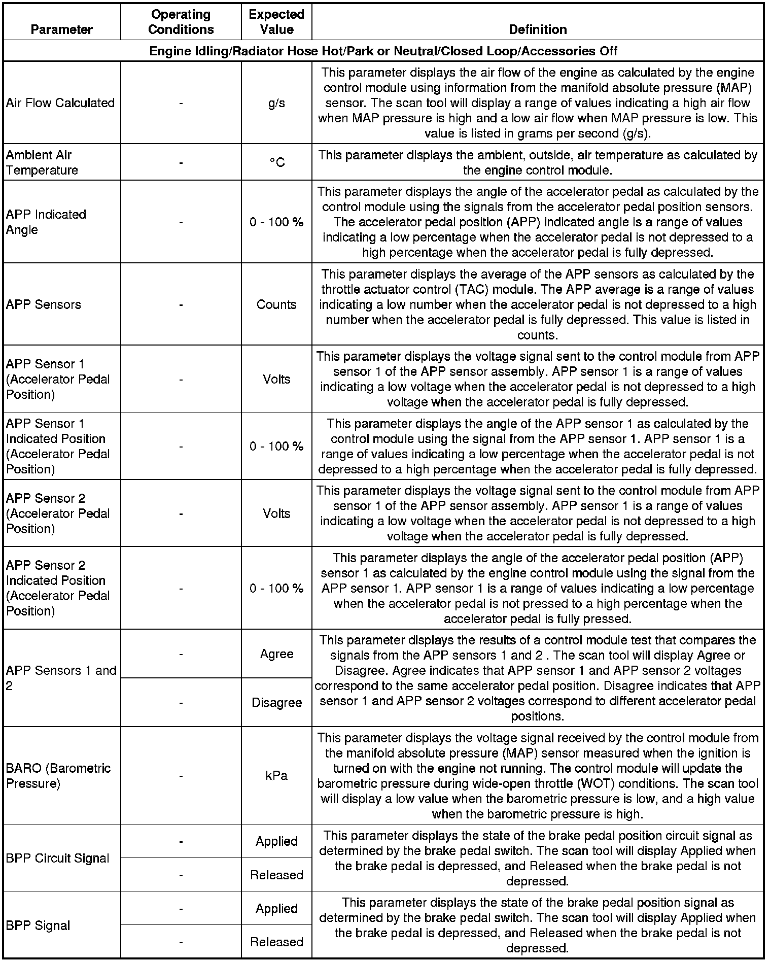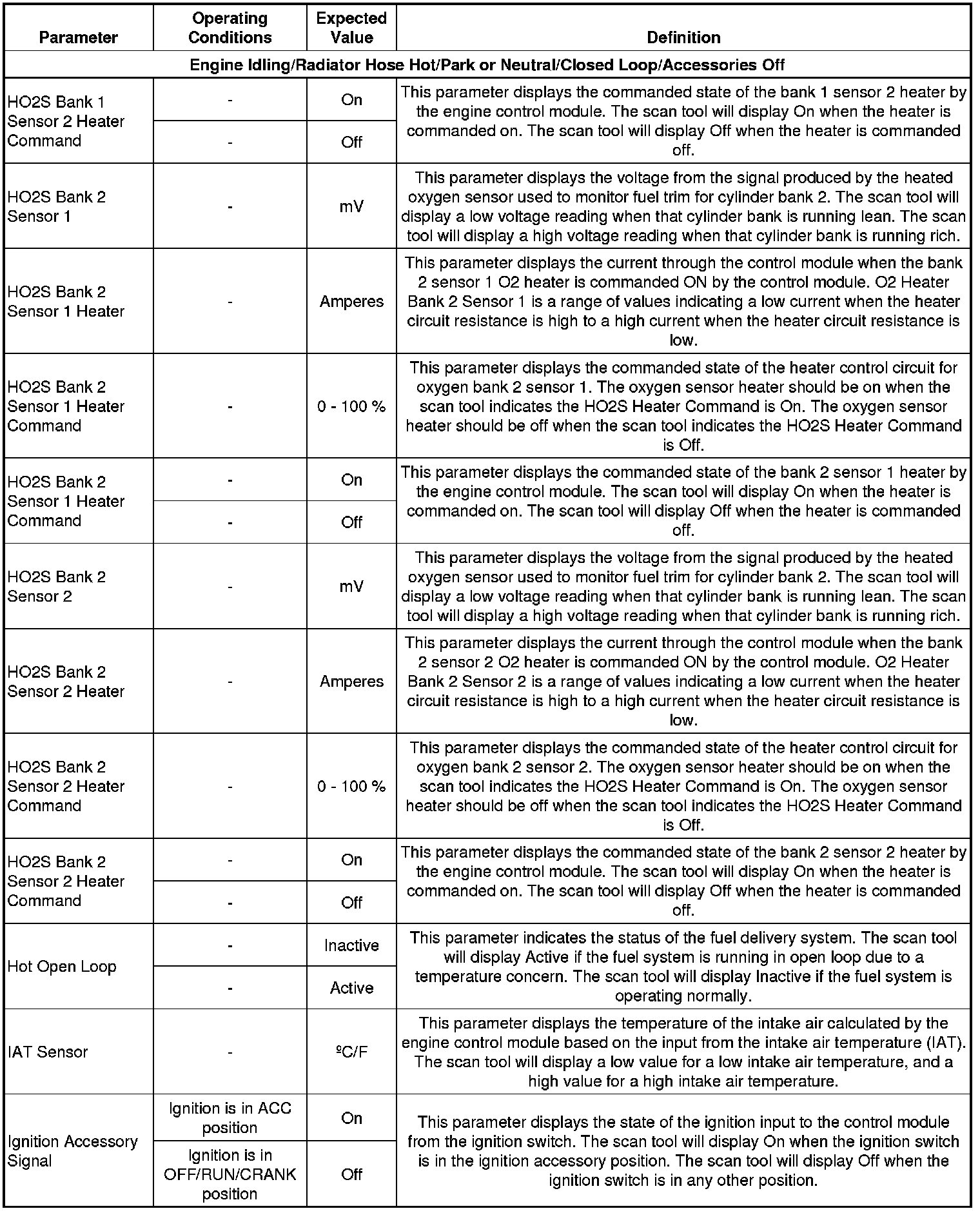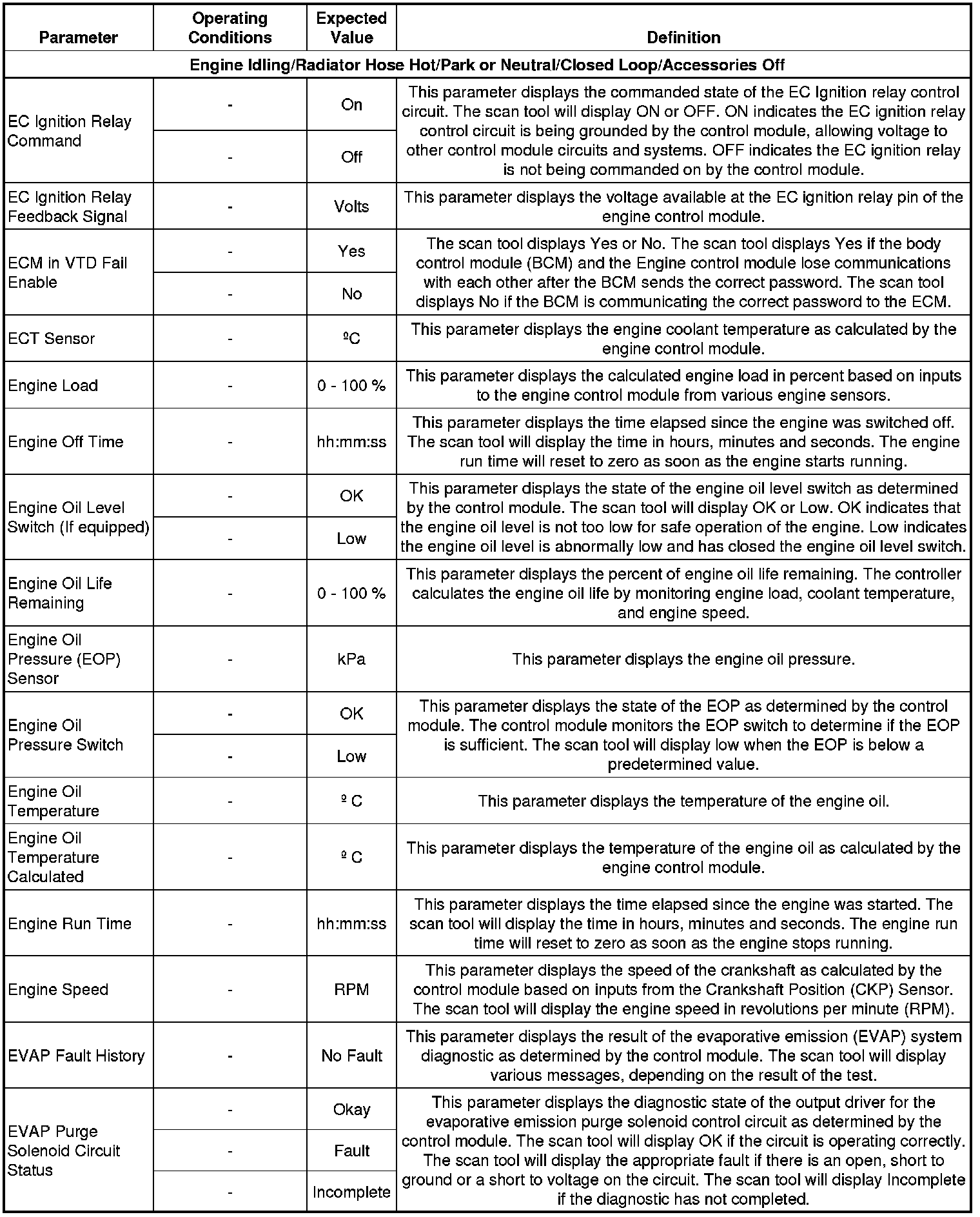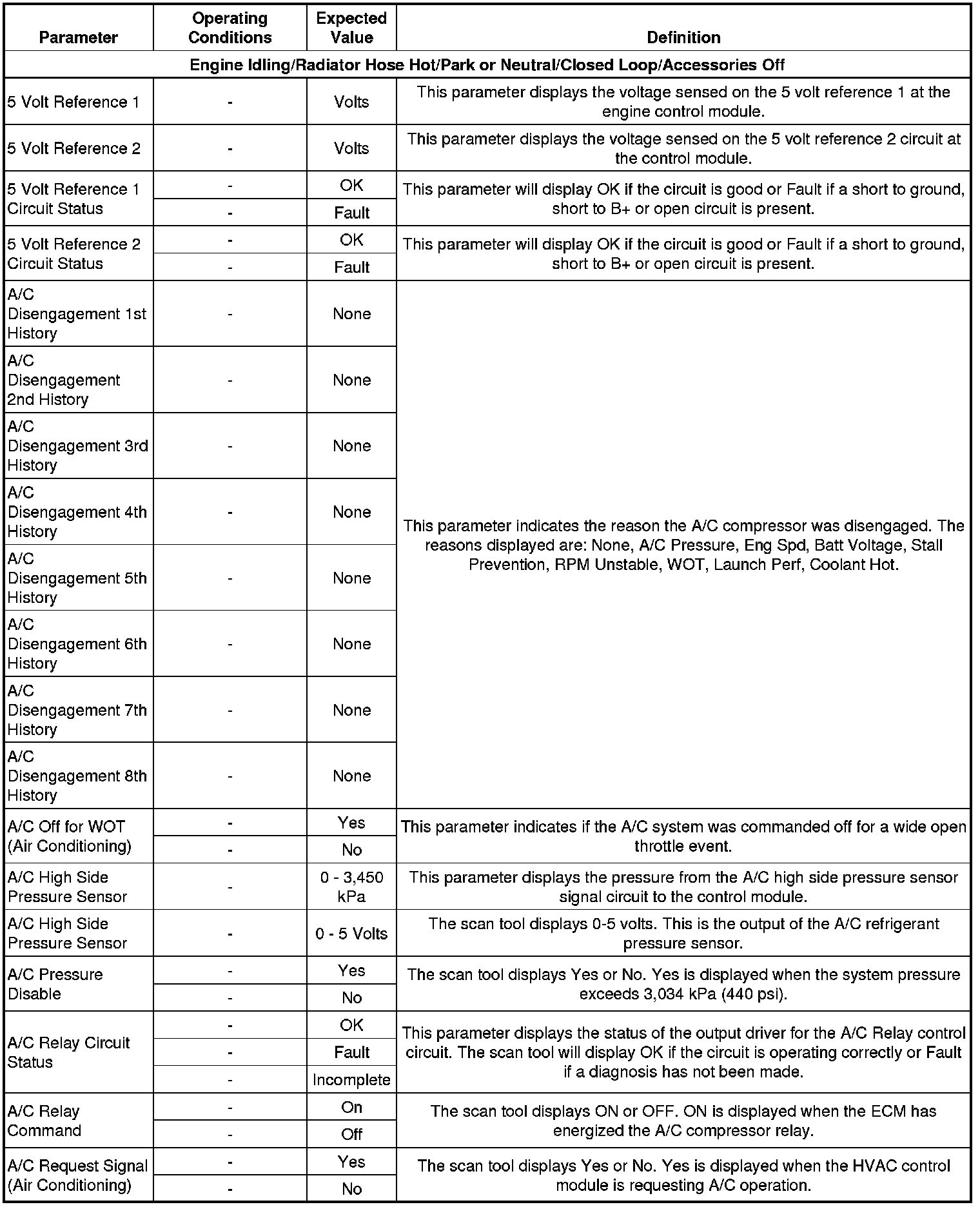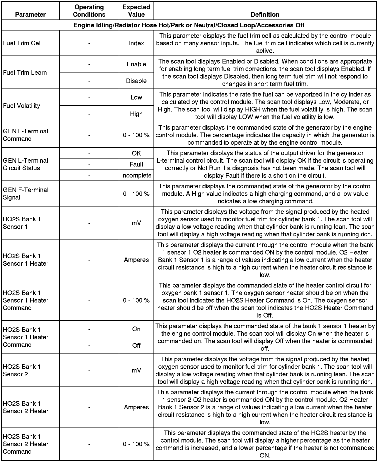 The Engine Scan Tool Data List contains all engine related parameters that are available on the scan tool. The list is arranged in alphabetical order. A parameter may appear in any one of the data lists and in some cases may appear more than once or in more than one data list in order to group certain related parameters together.