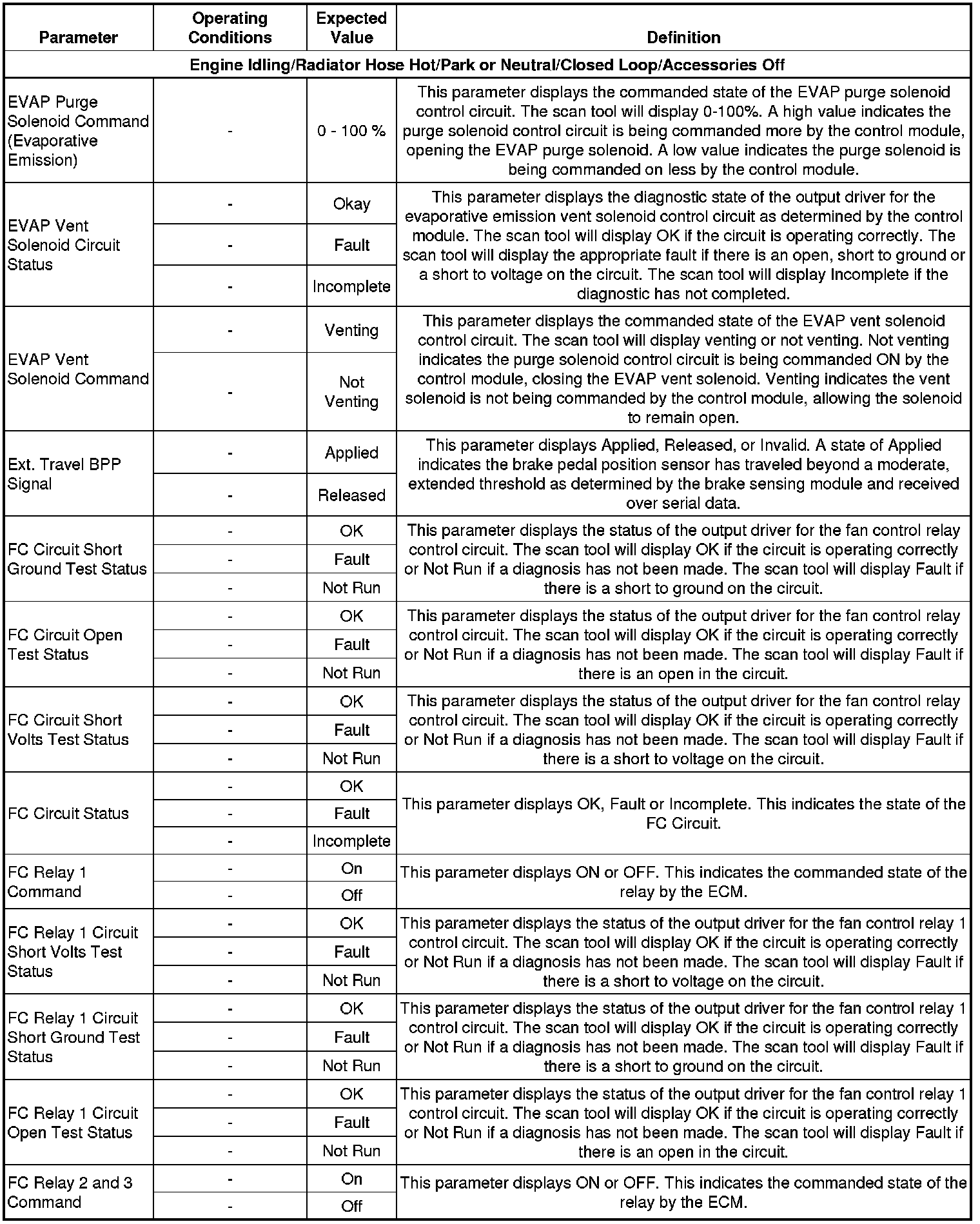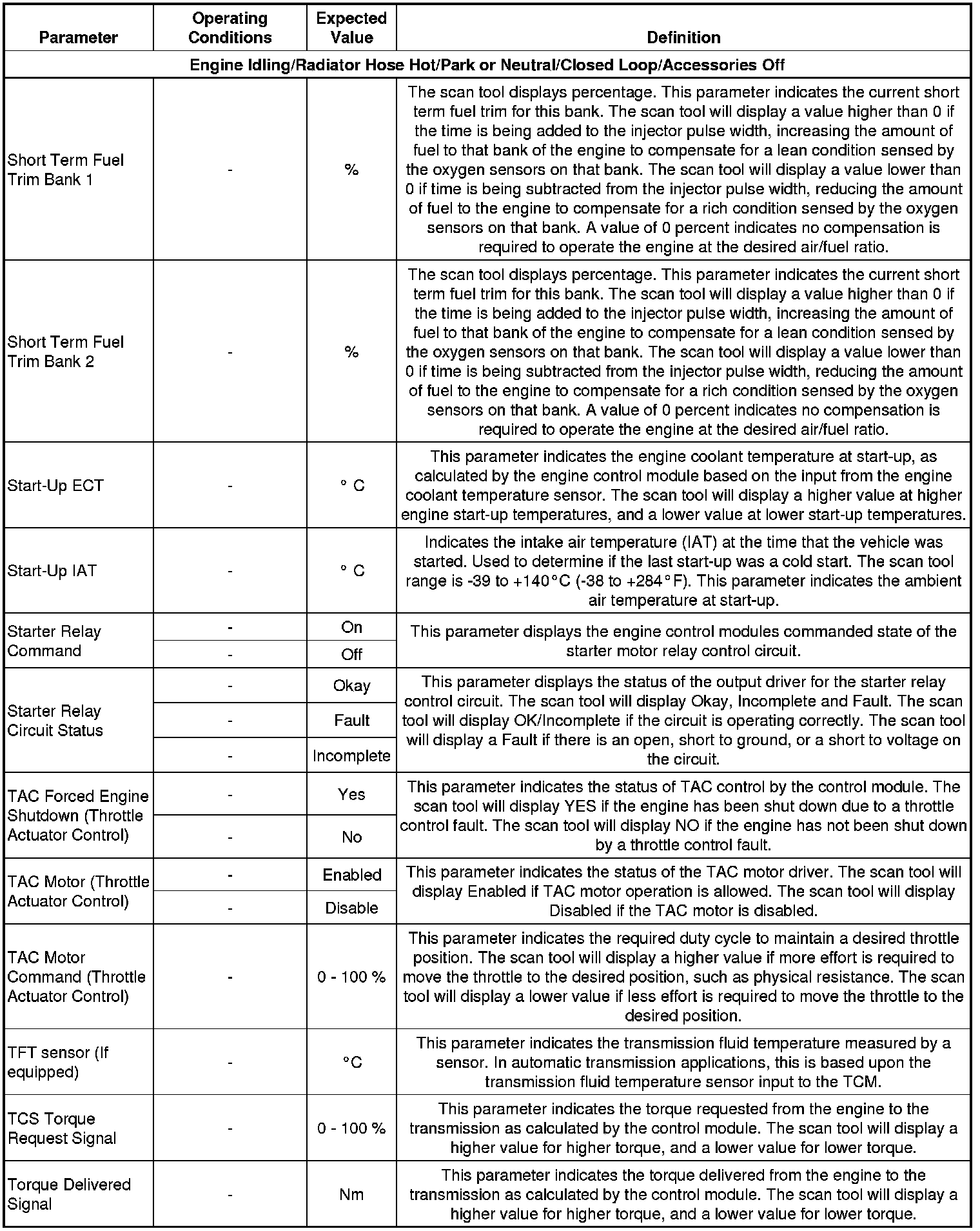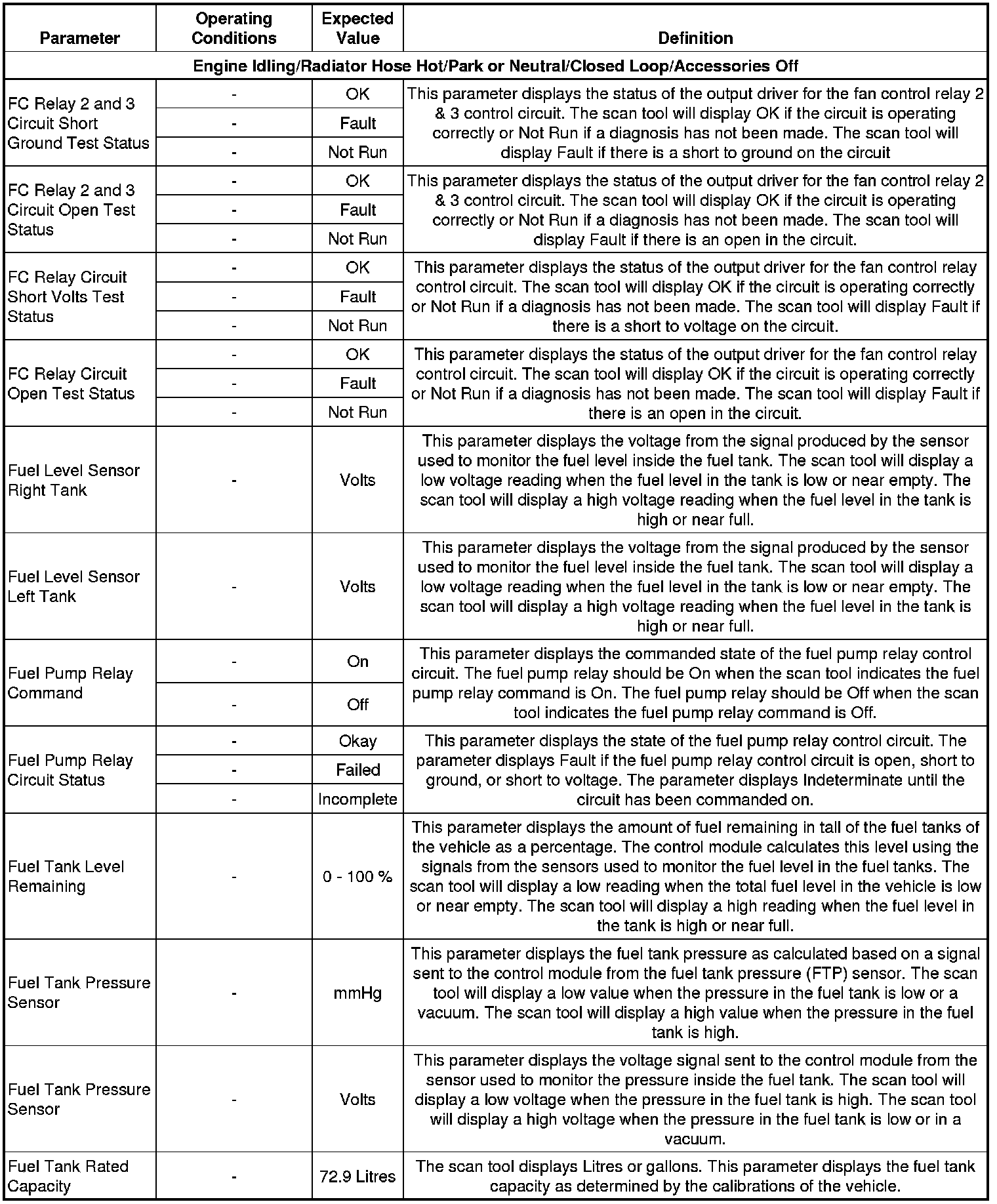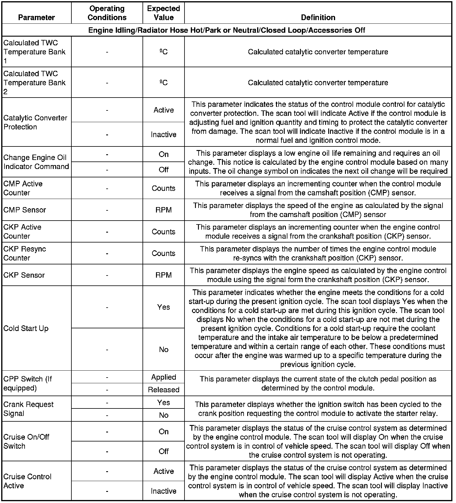 The Engine Scan Tool Data List contains all engine related parameters that are available on the scan tool. The list is arranged in alphabetical order. A parameter may appear in any one of the data lists and in some cases may appear more than once or in more than one data list in order to group certain related parameters together.