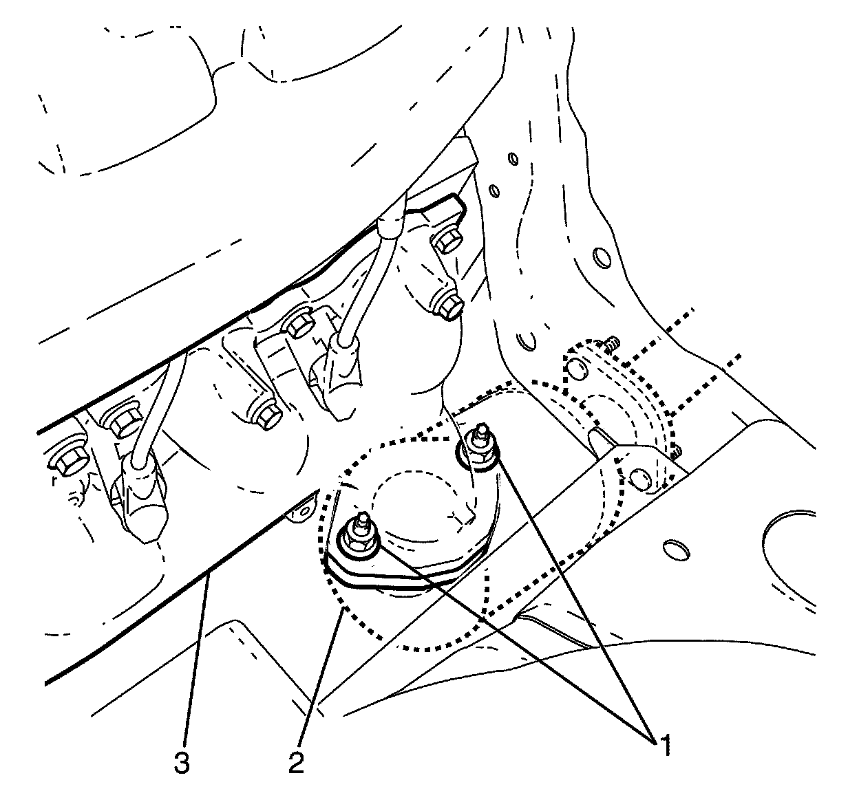 4. Push up and forward on the left catalytic converter (2) to connect to the exhaust manifold (3).