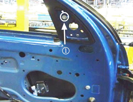 4. Fasten the top bolt (1) on the front window run channel finger tight.