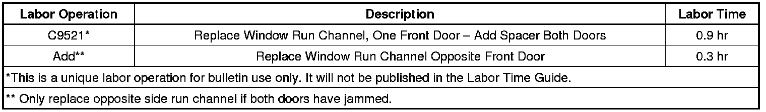Replace the window front run channel on the affected door, and add the GM service part foam spacer (noted in the part table below) to BOTH front doors, following the steps below: