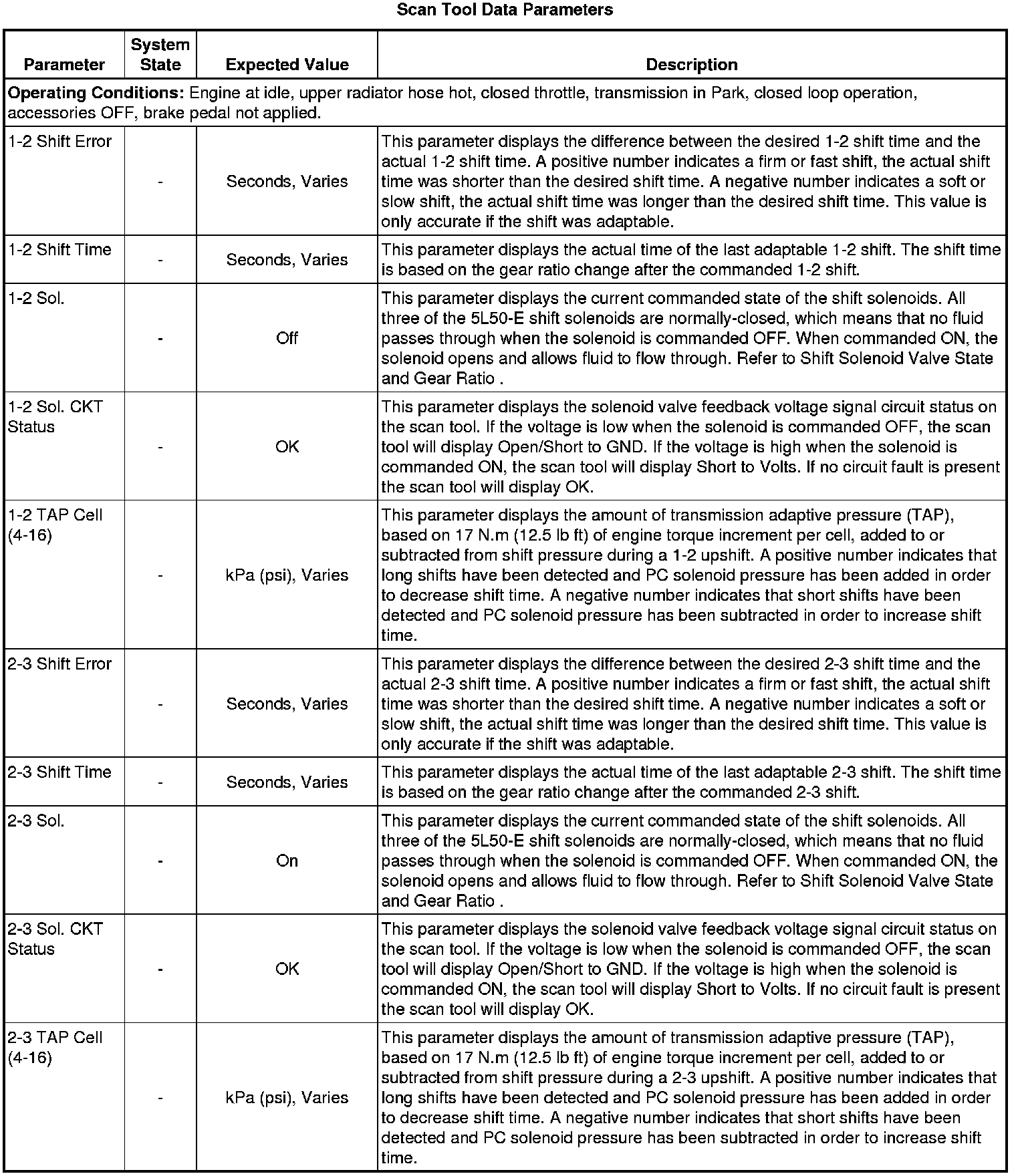 The scan tool values from a properly functioning transmission may be used for comparison with the transmission you are diagnosing. The values below represent a typical display recorded from a properly functioning system.