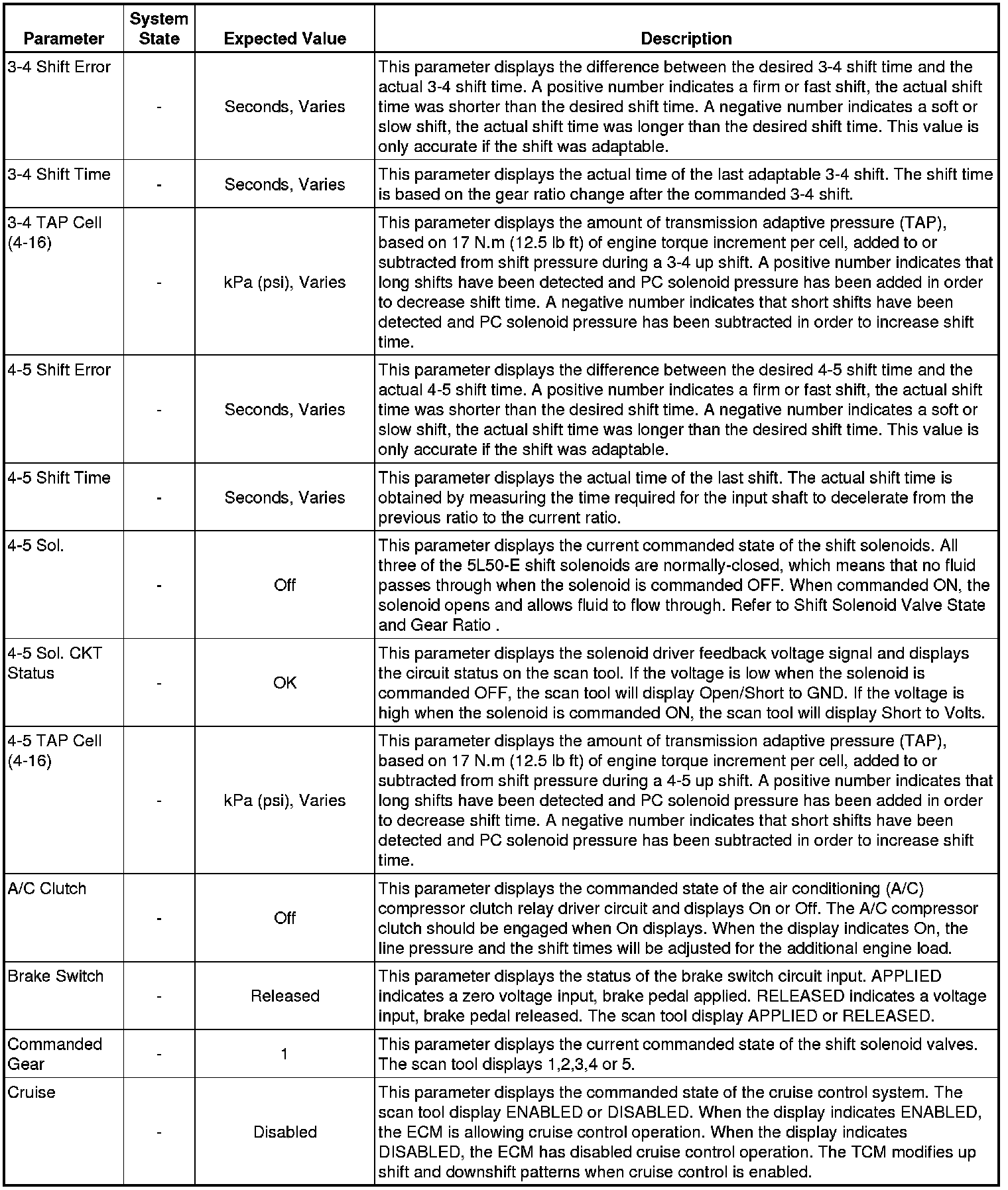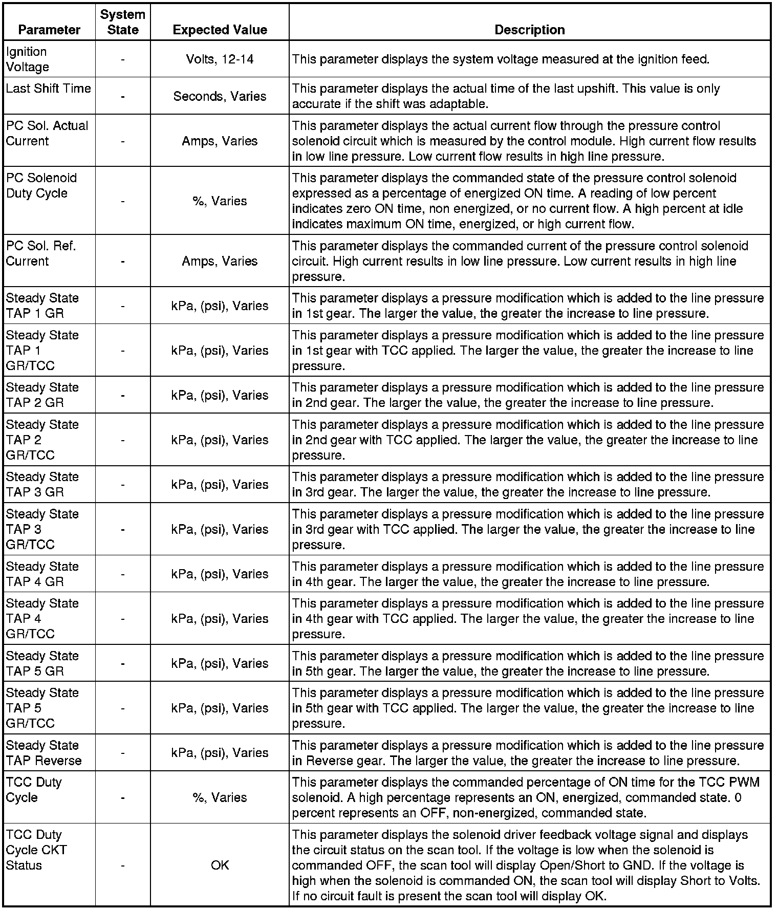 The Transmission Control Module Scan Tool Data List contains all transmission related parameters that are available on the scan tool. The list is arranged in alphabetical order. A given parameter may appear in any one of the data lists, and in some cases may appear more than once, or in more than one data list in order to group certain related parameters together.
