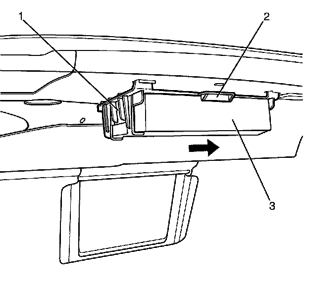 3. Remove the VCIM (3) by pressing up on the retaining clip (2) and sliding the VCIM (3) out of the supporting bracket (1).