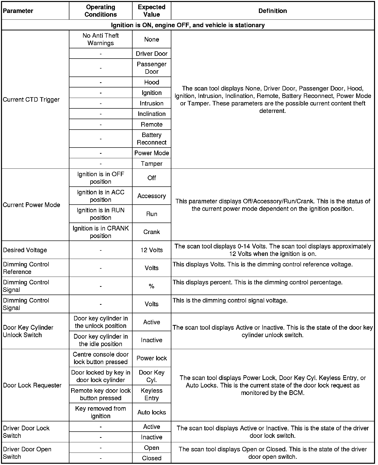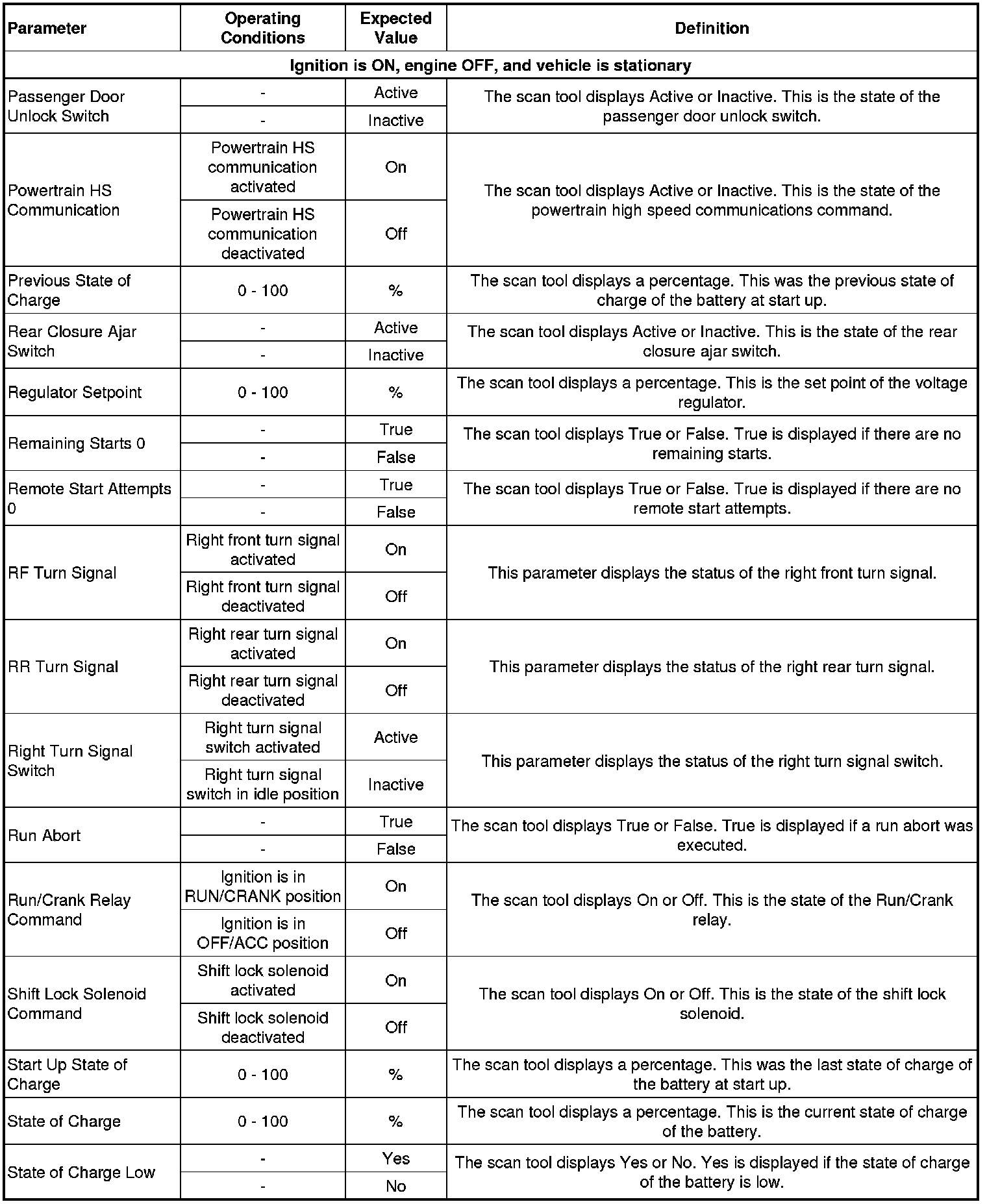 Use the scan tool data display values and definitions information in order to assist in diagnosing vehicle malfunctions. Compare the vehicles actual scan tool data with the typical data display value table information. Use the information in order to aid in understanding the nature of the concern when the vehicle data does not match the typical data display values.