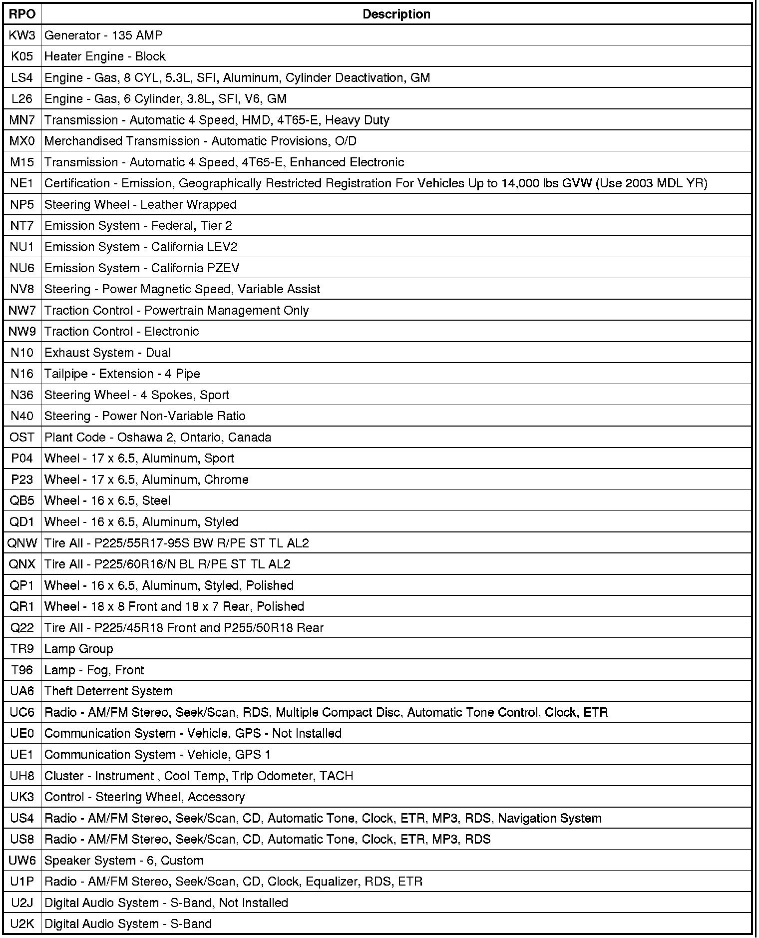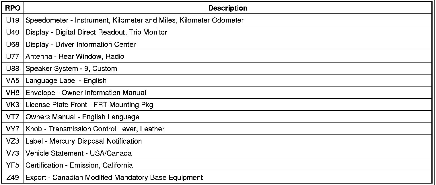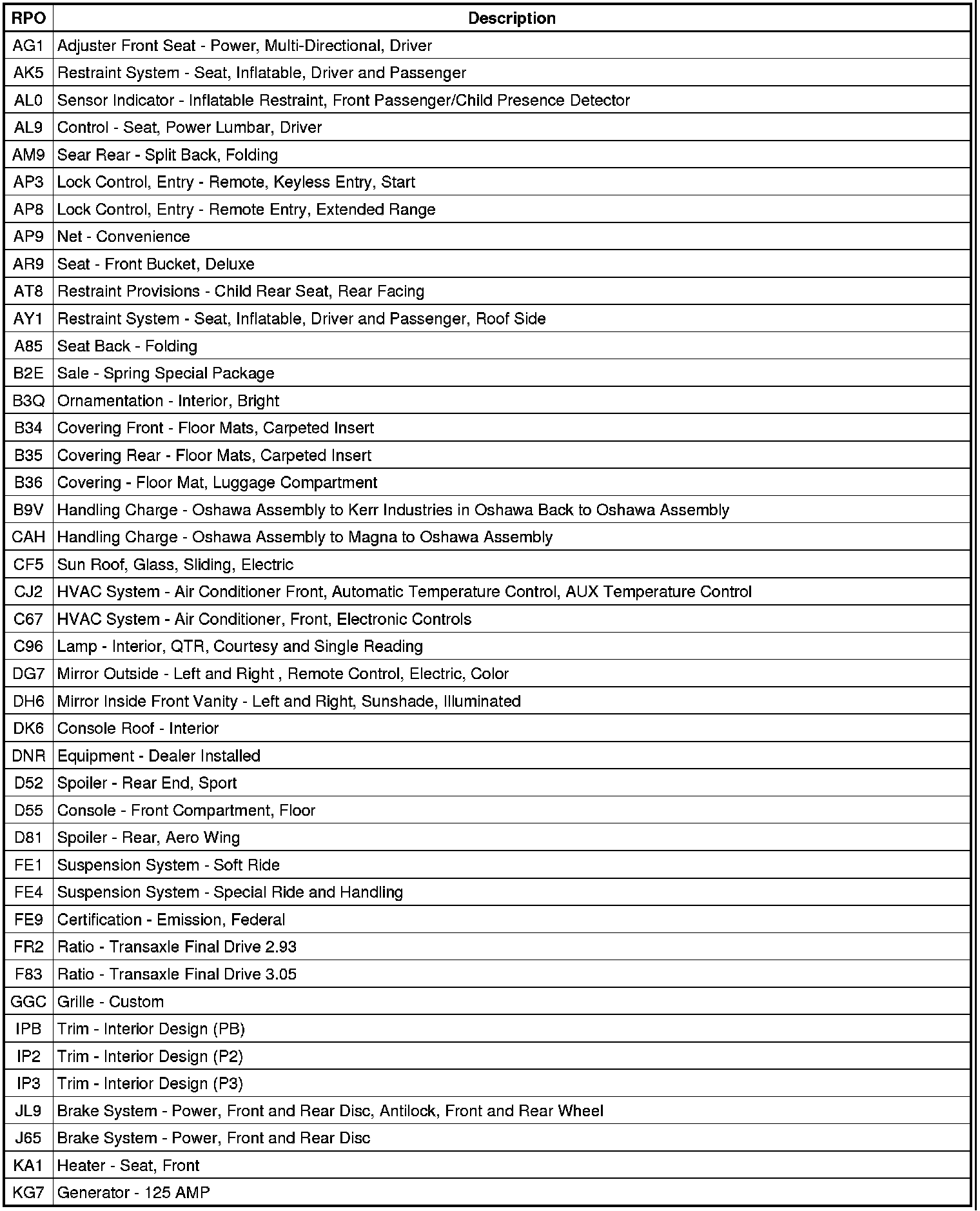 RPO Code List