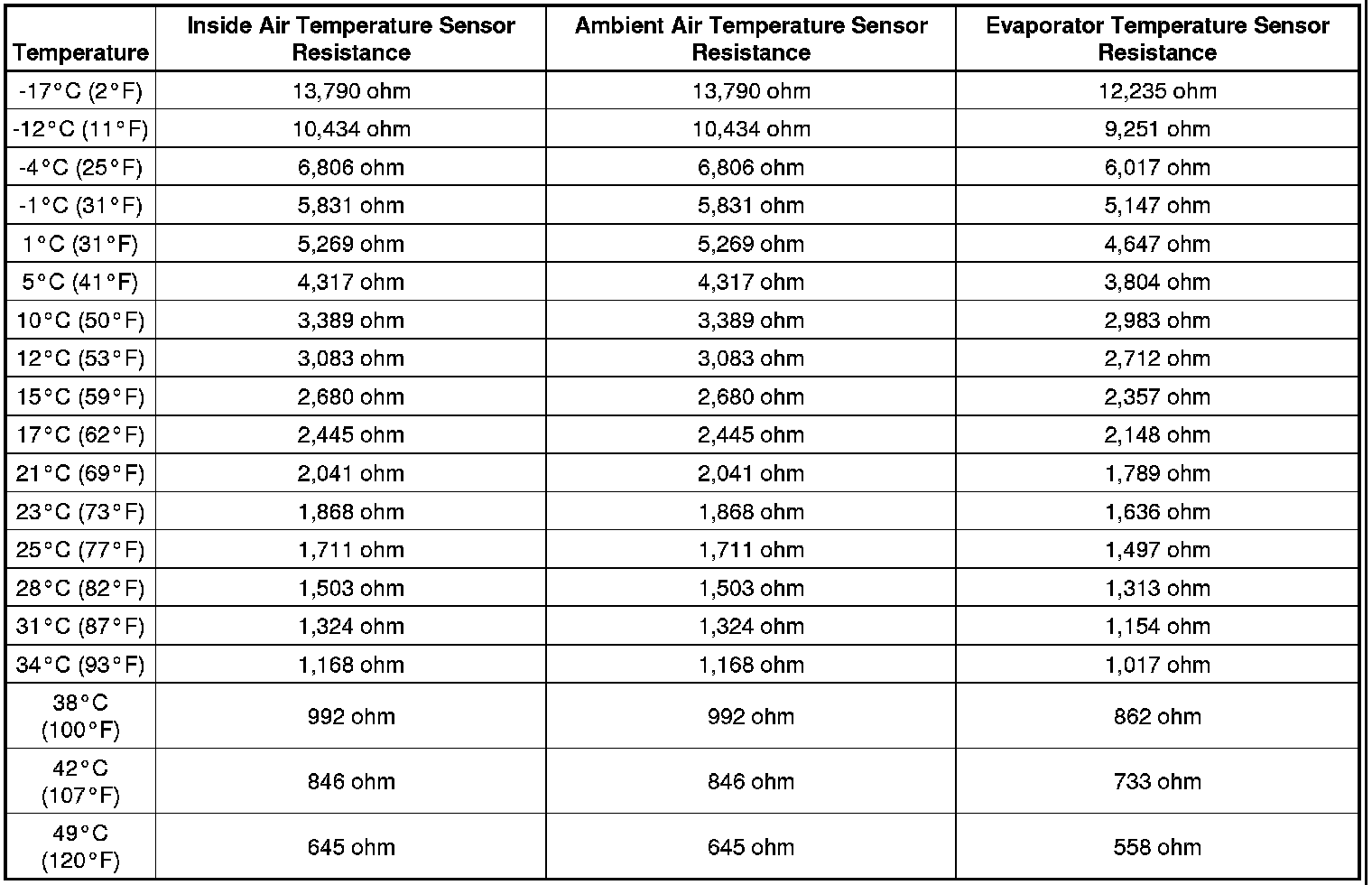 Sensor Resistance Table