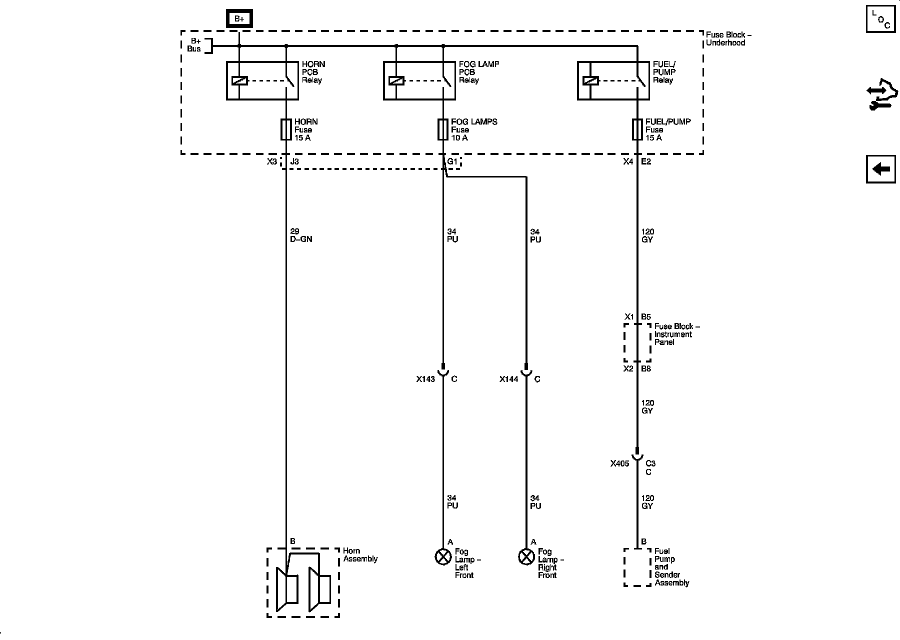 Horn, Fog Lamps, Fuel / Pump Fuses, Horn PCB, Fog Lamp PCB, and Fuel / Pump Relays (LS4 - 5.3L)
