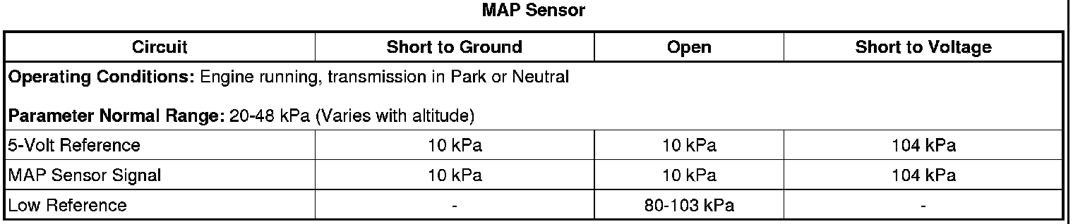 • If the MAP sensor is less than 103 kPa, then test the MAP sensor signal circuit for a short to ground, an open, high resistance. If the circuit tests normal, replace the control module.