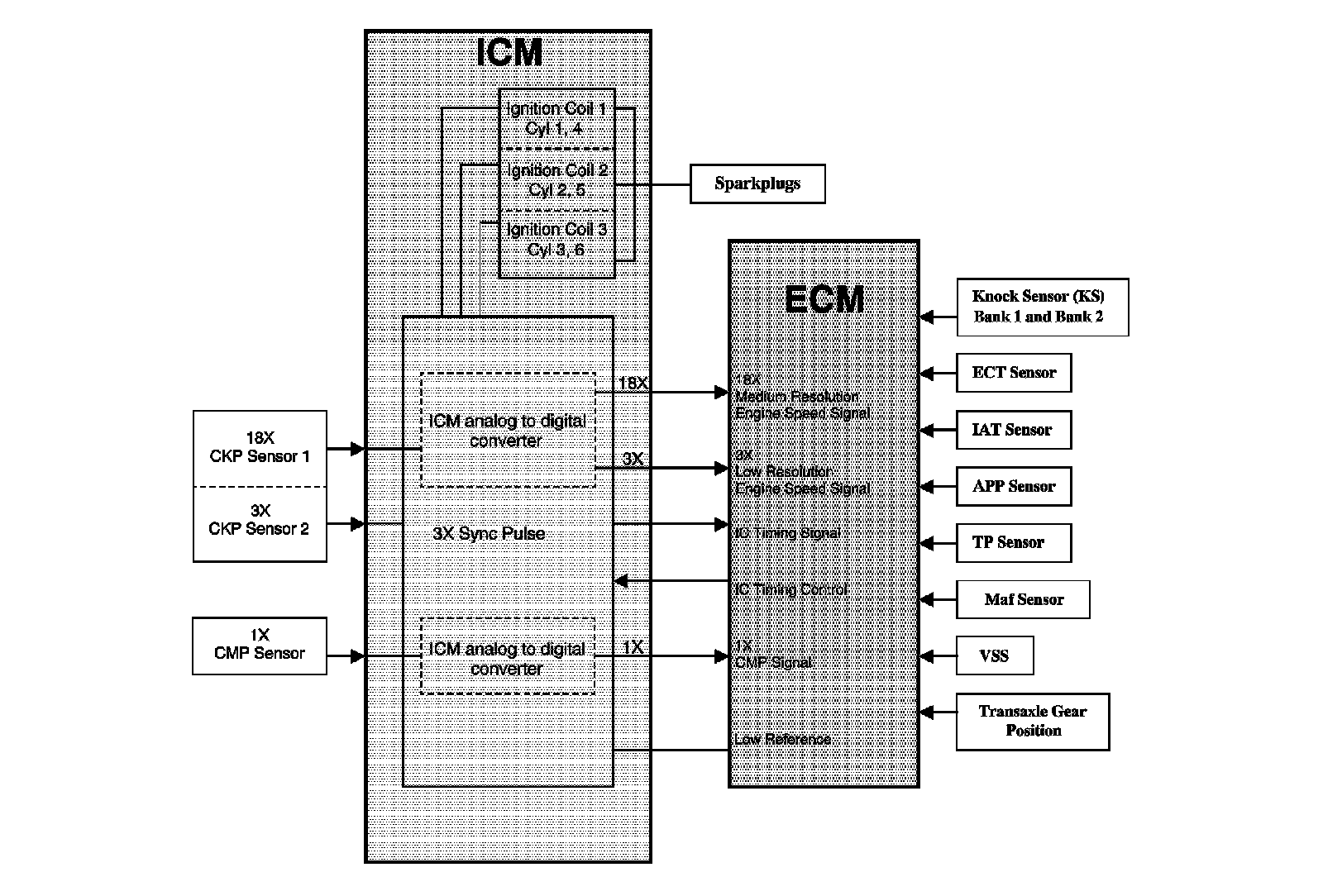 The 18X CKP Sensor 1 signal is also used by the ICM to convert the analog signal to a digital 18X signal for use by the PCM.