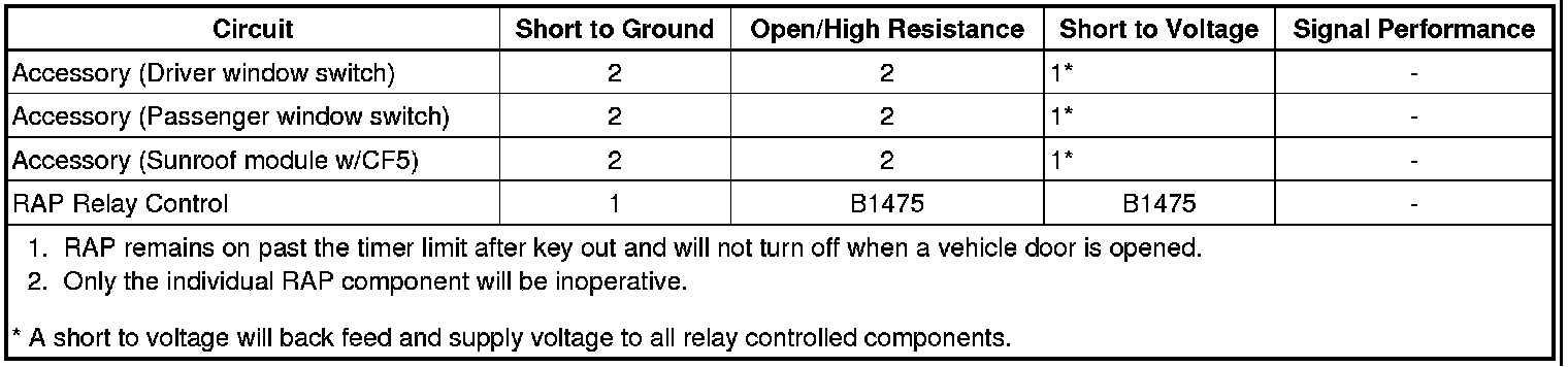 * A short to voltage on the RAP relay control or switched voltage circuits would cause the relay controlled RAP functions to remain on past the designated time.