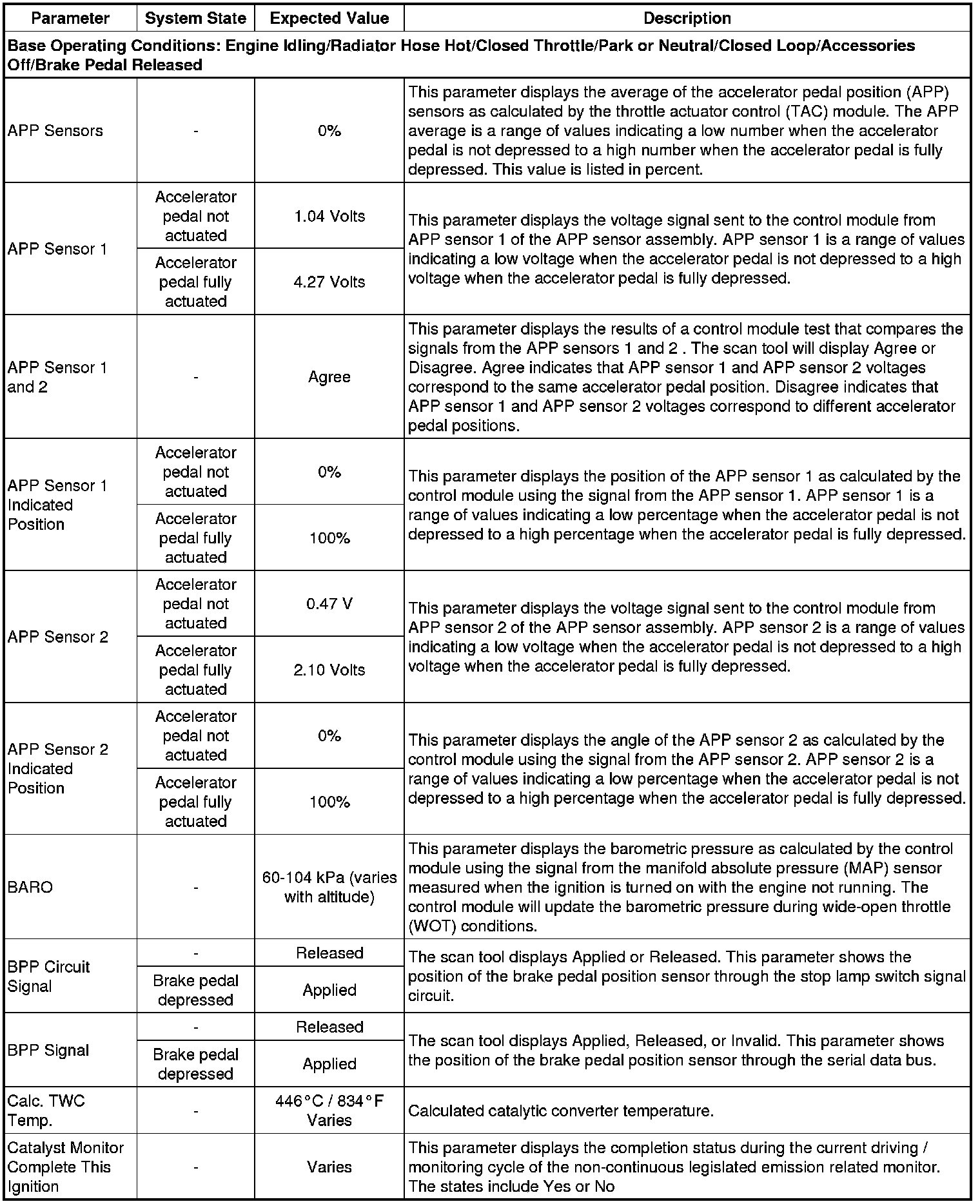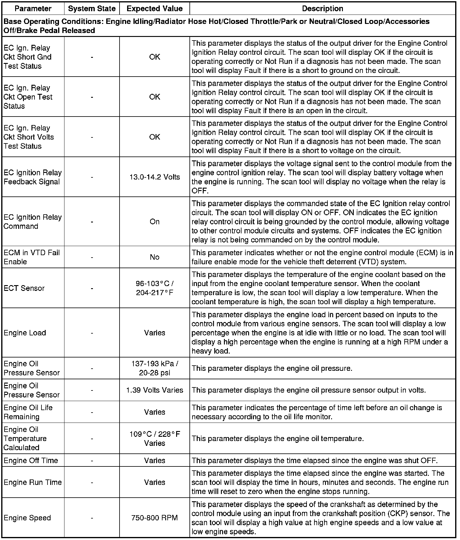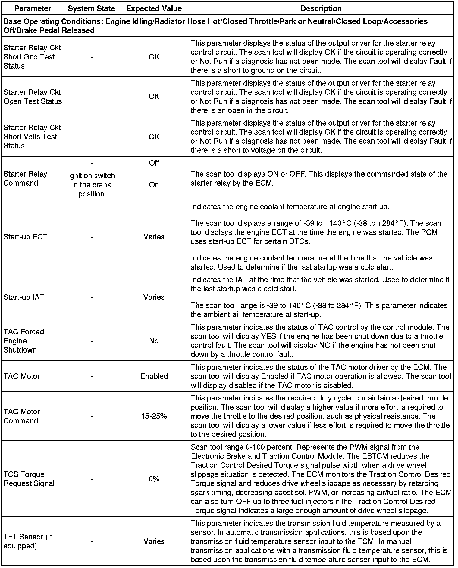 Only the parameters listed below are referenced in this service manual for use in diagnosis. If all values are within the typical range described below, refer to Symptoms - Engine Controls (- Symptoms - Engine Controls) for the 2.4L engine for diagnosis.