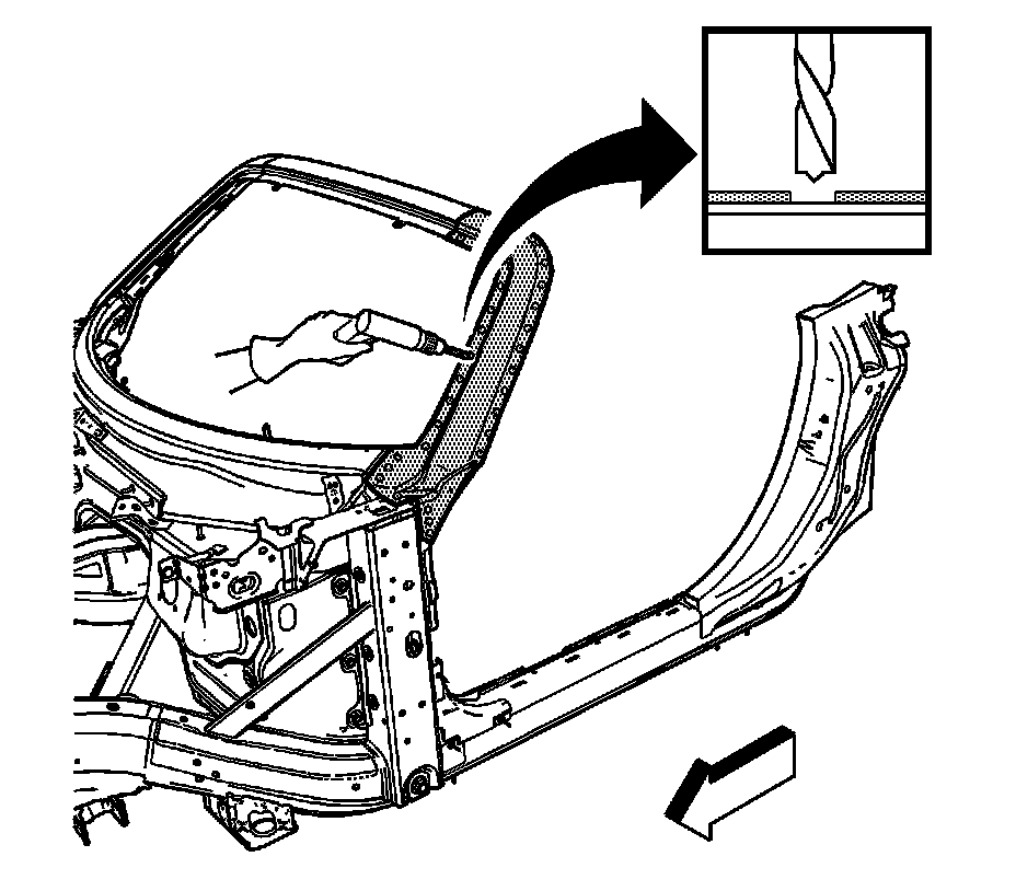 1.Drill 8 mm (5/16 in) plug weld holes in the service part as necessary at the locations noted from the original windshield frame side panel.