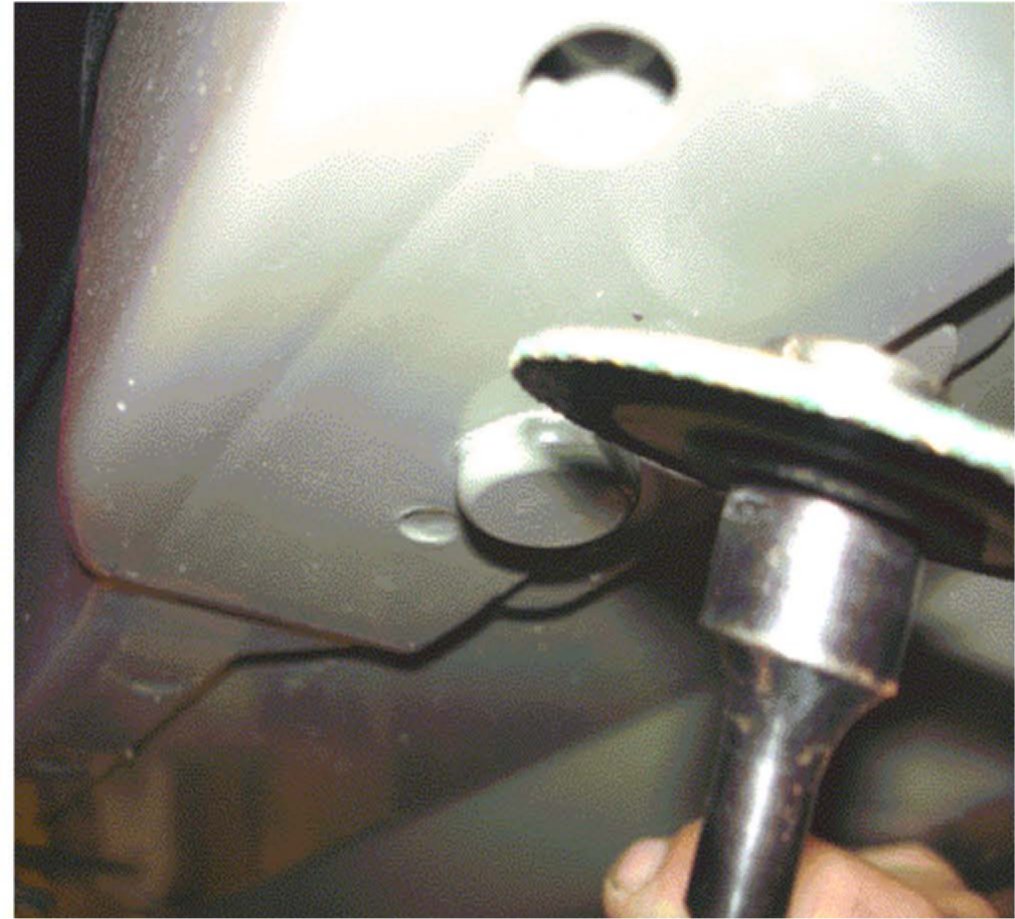 4. Using a grinder (or equivalent tool) remove the three spot welds from the cap of each seat adjuster stud that is to be replaced.