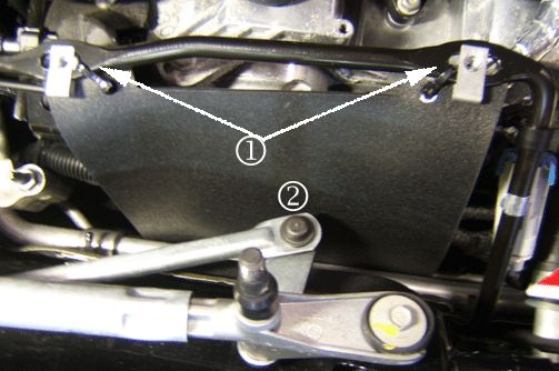 5. Attach the water deflector shield, GM P/N 25875802, to the air inlet grille panel bracket rod using two plastic tie straps (obtain locally). The shield is attached to the rod in two locations (1). The wiper arm should not contact the water deflector shield (2).