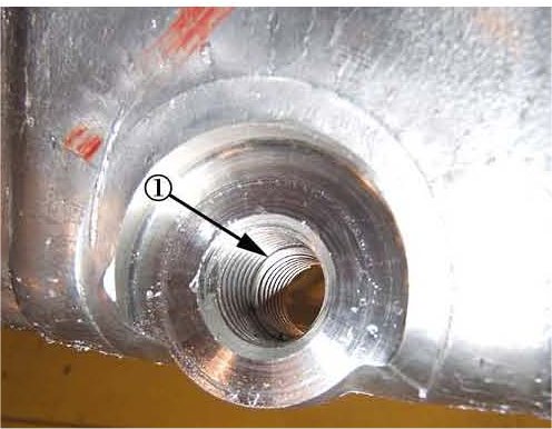 ^ If the oil pan thread insert (1) is installed too deeply inside the oil pan drain plug hole, refer to Step 5.