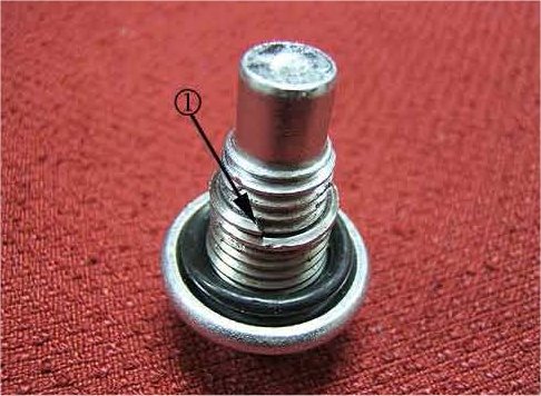 ^ If the oil pan thread insert (1) came out with the drain plug, install a new insert, refer to Step 7.