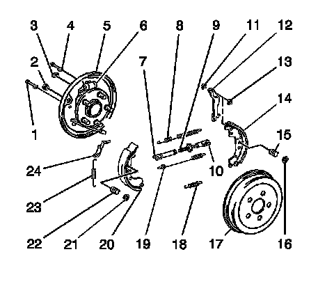 2. Remove the hardware (8,15,18,19,22) with the shoes. Refer to Brake Shoe Replacement (FWD) (Service and Repair).