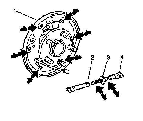 1. Apply Lubriplate(R) Lubricant, GM P/N 1050109, Canadian P/N 5264008, or the equivalent, to the metal contact points on the backing plate (1) and the adjuster strut (3).