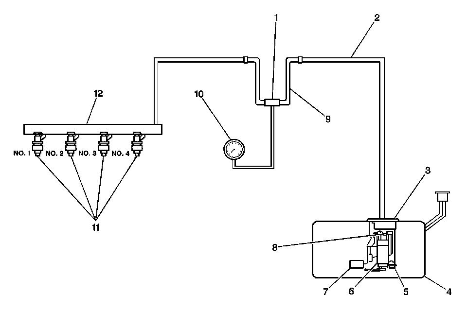 The supply of fuel is stored in the fuel tank. An electric fuel pump pressurizes the fuel through to the fuel filter and out to the fuel lines and the fuel rail. The electric fuel pump is suspended from the top of the fuel tank as part of the fuel sender assembly. The fuel pump is designed to provide fuel at a pressure above the regulated pressure needed by the fuel injectors. The fuel pressure regulator keeps the fuel supplied to the fuel injectors at the regulated pressure.