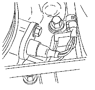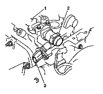 The knock sensor (KS) (1) is located below the intake manifold (2), on the engine block between cylinder 2 and cylinder 3. The KS detects engine detonation and sends a signal to the PCM. The PCM uses the input from the KS to adjust the ignition timing in order to control detonation. For detailed information on the operation of the KS refer to Knock Sensor (KS) System Description (Knock Sensor (KS) System Description).