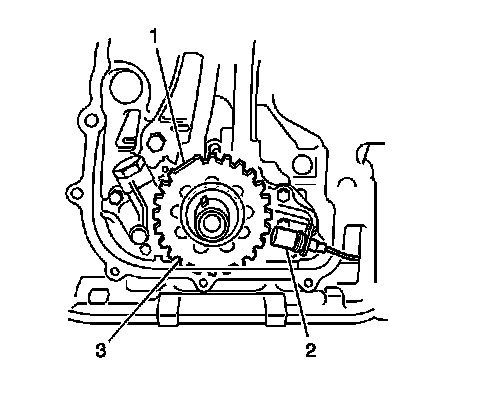 The CKP sensor reluctor (3) has 34 teeth and is mounted on the crankshaft behind the timing chain cover and the crankshaft pulley. When the crankshaft rotates, the CKP sensor signal rotor teeth pass by the CKP sensor (2) causing a fluctuation in the sensors magnetic field. The fluctuation in the magnetic field induces a voltage in the CKP sensor circuitry that corresponds to every 10 degrees of crankshaft rotation. The reluctor has one wide tooth (1) that indicates top dead center (TDC) of the number 1 cylinder. With the information that the PCM receives from the CKP sensor, the PCM determines engine speed and crankshaft position.