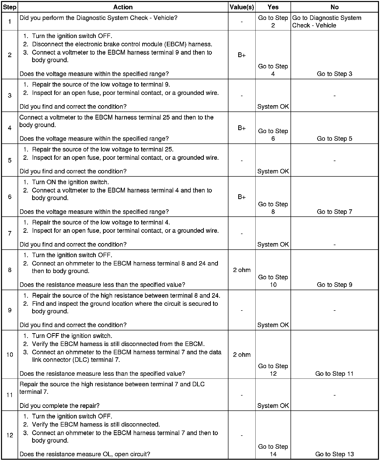Serial data is transmitted/received by the electronic brake control module (EBCM) through terminal 7. The EBCM is supplied with constant battery feed voltage through terminals 9 and 25, and switched ignition voltage through terminal 4. The EBCM ground is provided through terminal 8 and 24.
