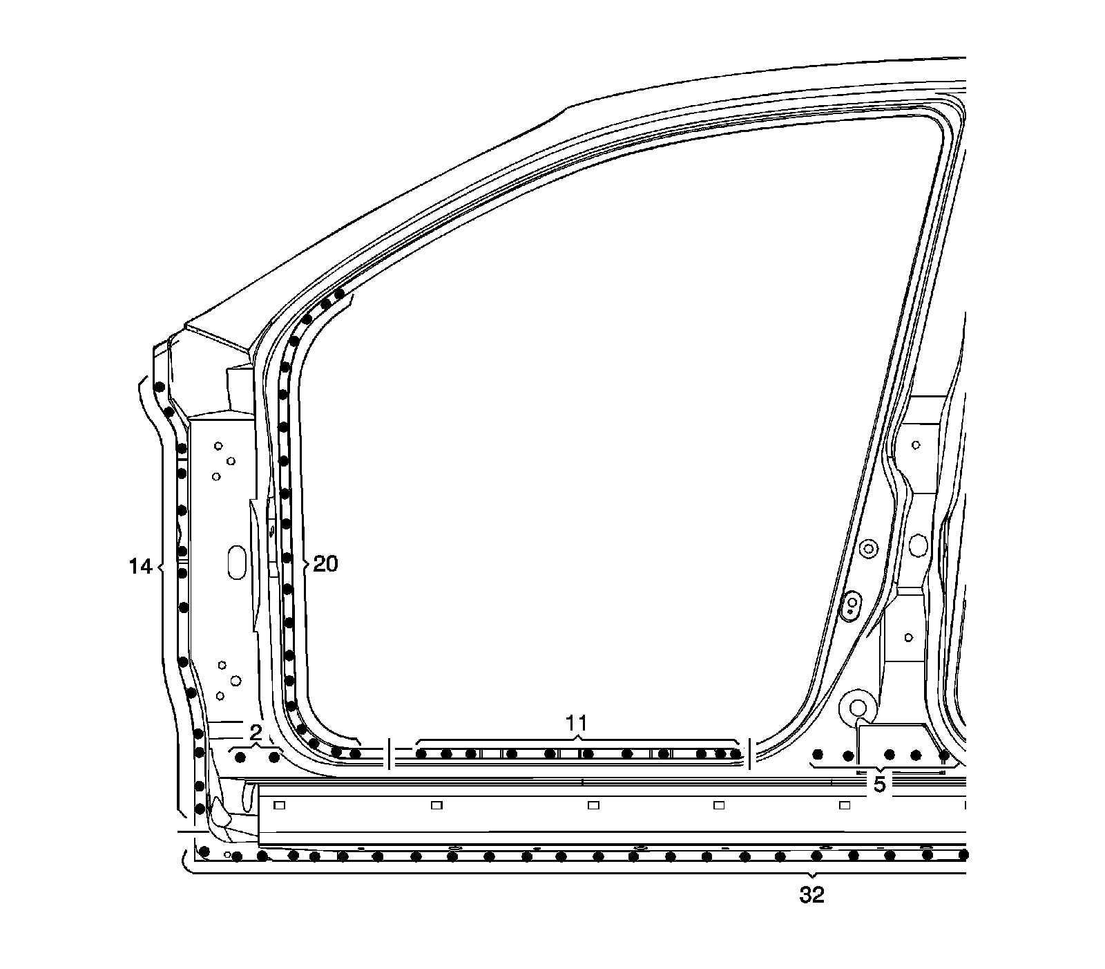 The frame door openings consist of frame door area and side outer area. It forms the base for the front, rear doors and other parts and maintains the rigidity of the doors and roof. The frame door opening area should, depending on the degree of damage, be repaired as much as possible rather than replaced. (Repair by pulling out)